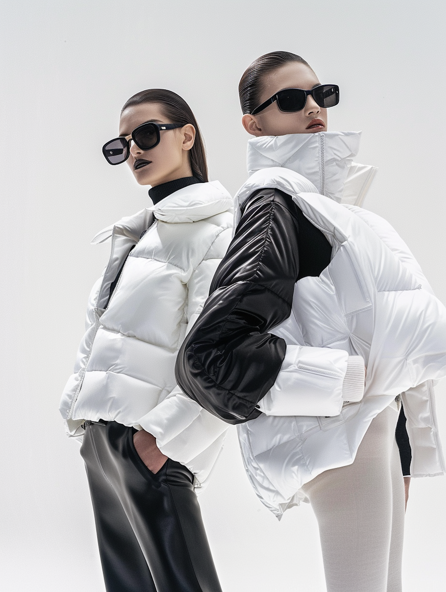 Two women in oversized white puffer jackets and sunglasses exude modern style against a minimalist background.
