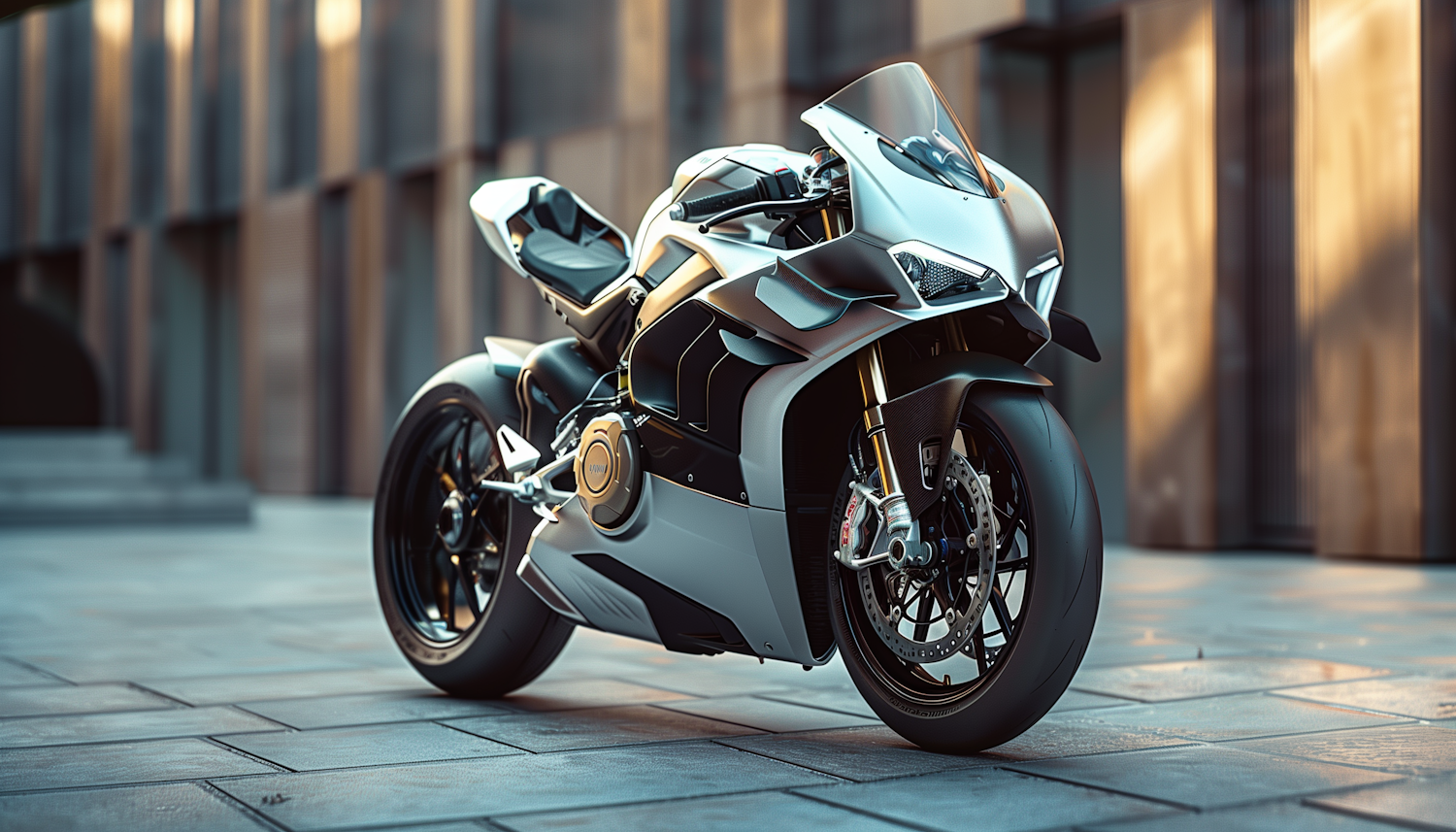 Sleek modern motorcycle with metallic silver and black design on urban pavement, showcasing aerodynamic lines and high-performance features.