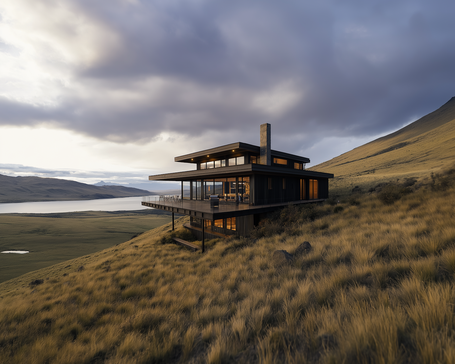 Modern hillside home with glass walls and balconies, overlooking a tranquil lake and mountains under a dramatic, cloudy sky.