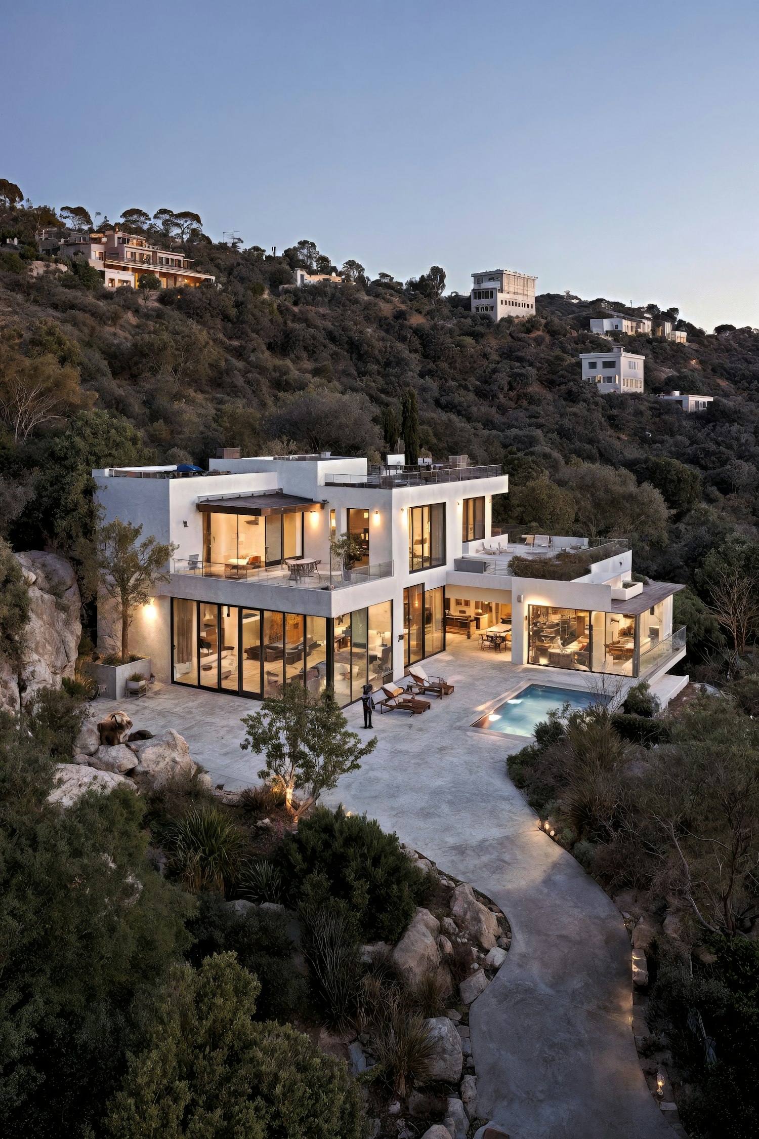 Modern hillside home with sleek design, large windows, pool, and lush surroundings, offering a luxurious and serene retreat.