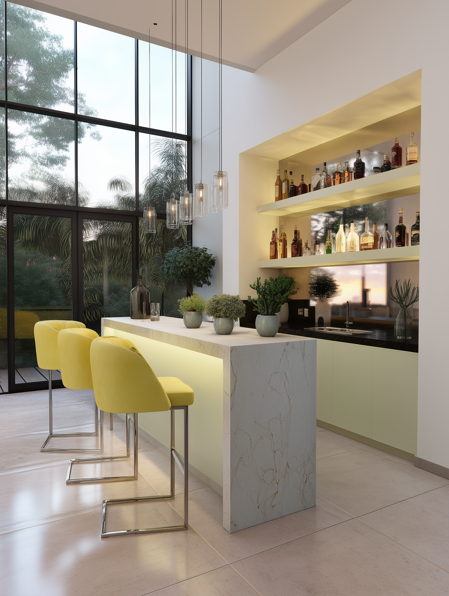 Modern home bar with marble counter, yellow stools, backlit shelves, and lush outdoor views through floor-to-ceiling windows.