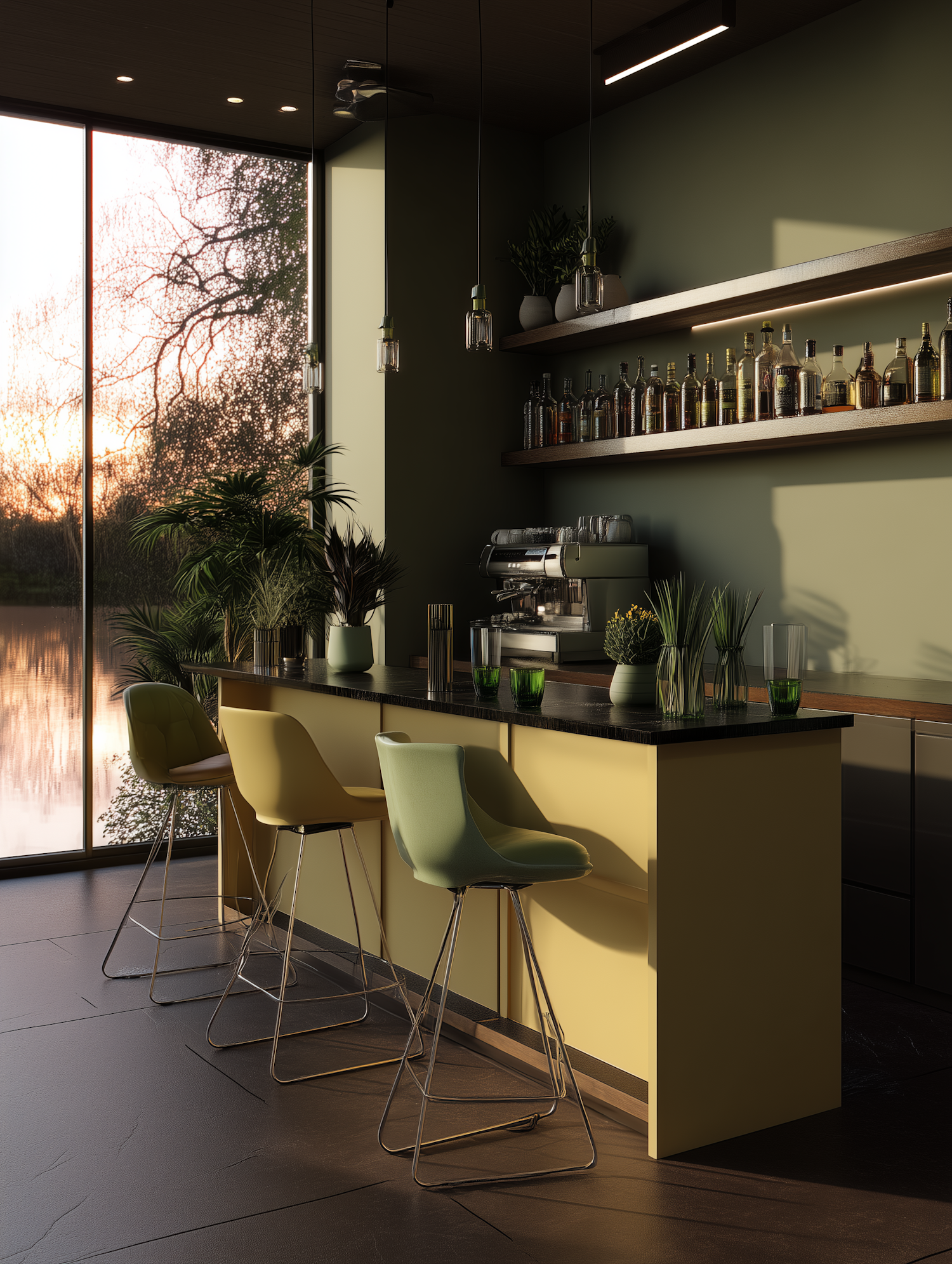 Modern home bar with yellow accents, green bar stools, and sunset views through large windows. Perfect blend of style and comfort.