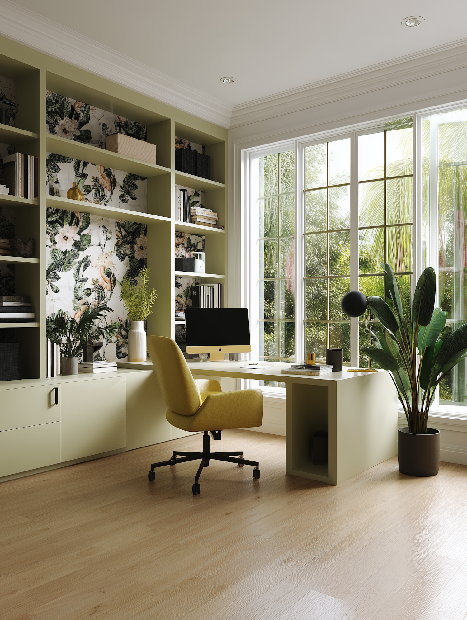 Bright home office with sage green shelves, floral wallpaper, mustard chair, and large windows overlooking lush greenery.