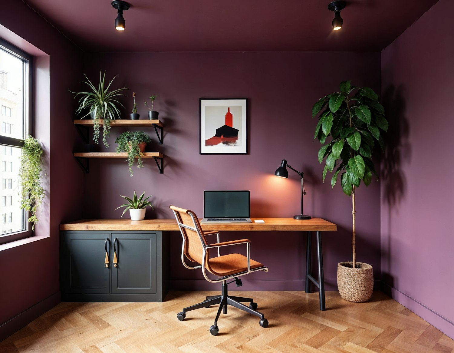 Stylish home office with plum walls, wooden desk, tan leather chair, lush plants, and herringbone flooring. Perfect for productivity.