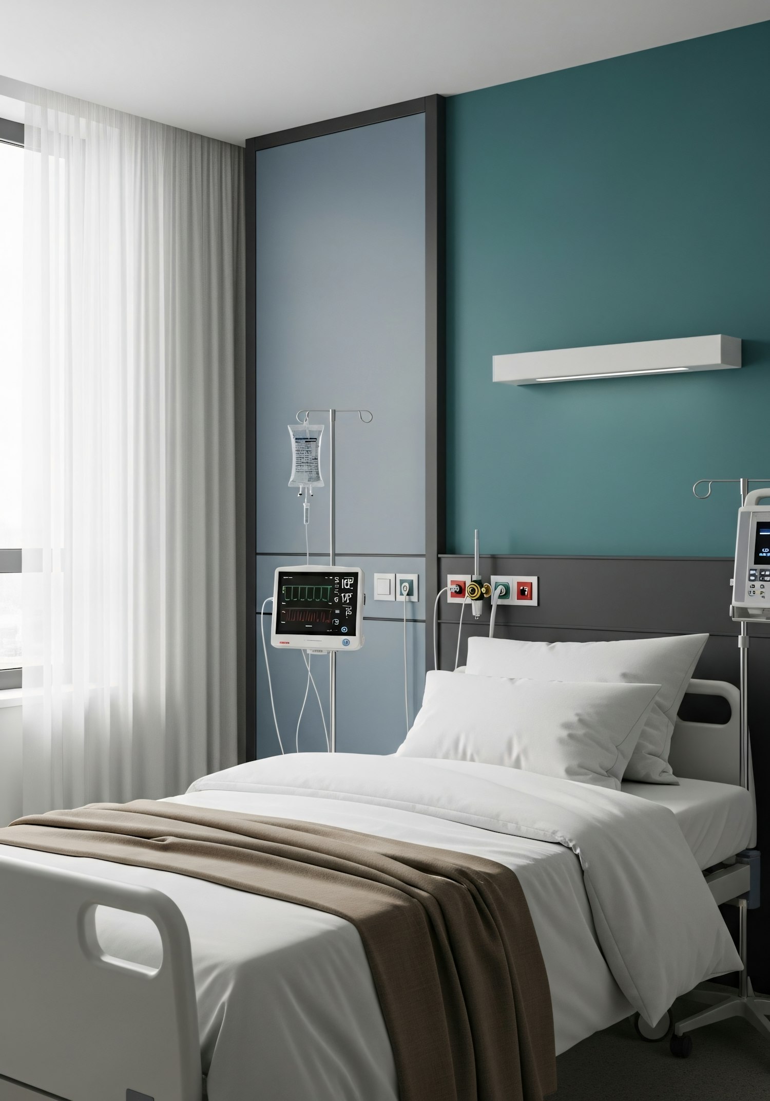 Modern hospital room with a neatly made bed, medical equipment, and soothing teal walls, creating a clean and comfortable environment.