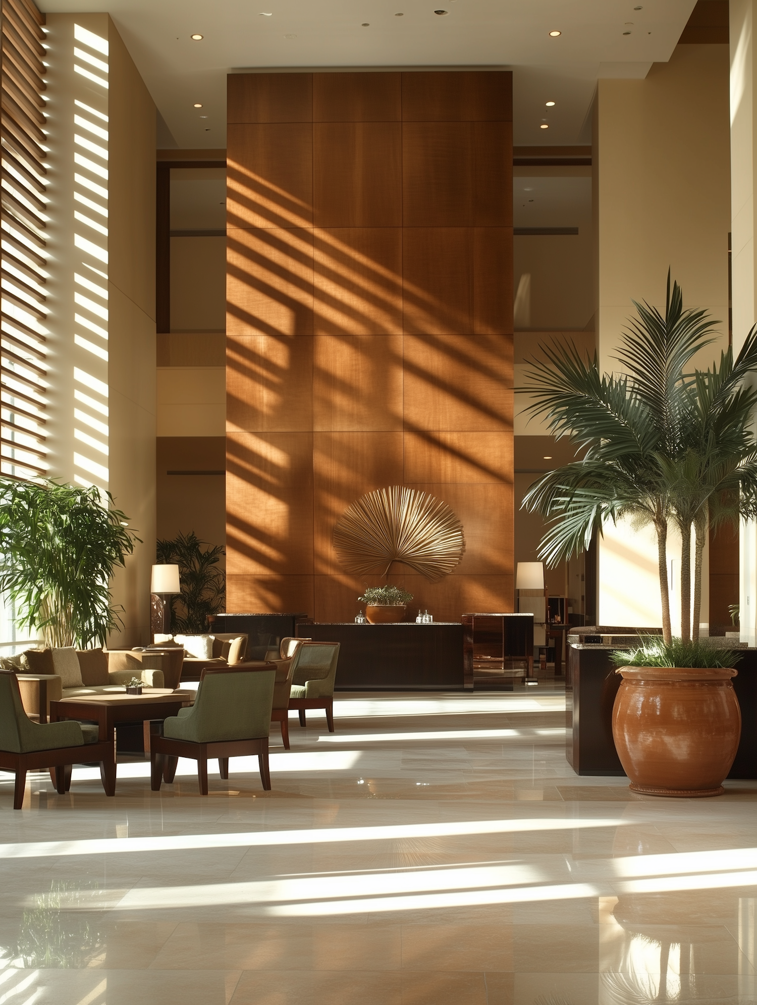 Elegant hotel lobby with wooden accents, green seating, potted plants, and sunlight streaming through slatted windows onto marble floors.
