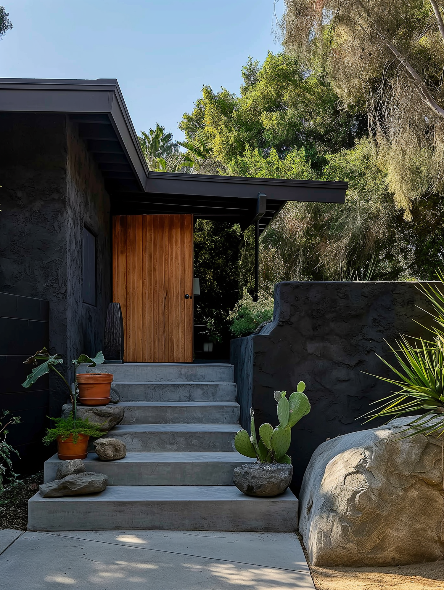 Modern house entrance with dark walls, a wooden door, concrete steps, potted plants, and desert landscaping surrounded by lush greenery.