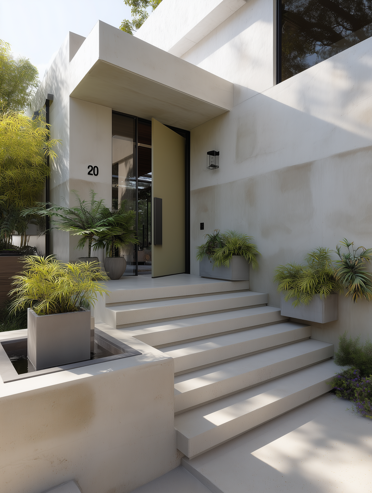 Modern minimalist house entrance with clean lines, lush greenery, and a serene water feature. Neutral tones and sleek design elements.