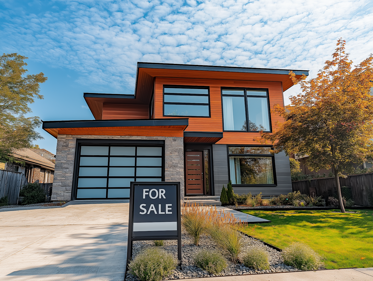 Modern two-story house with large windows and a 'FOR SALE' sign, set against a clear blue sky and lush green lawn.