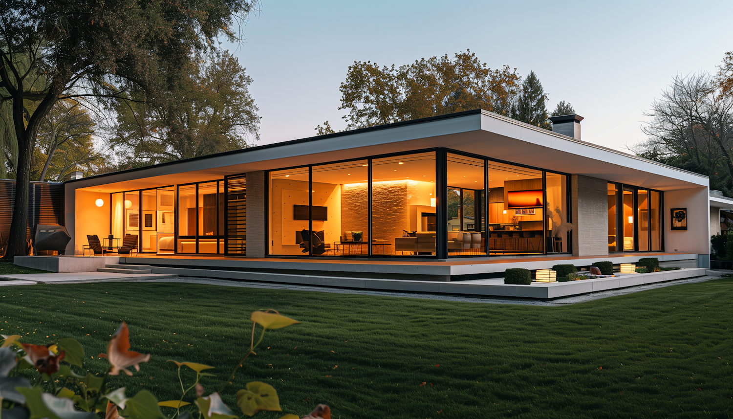 Modern single-story house with large glass windows, warm interior lighting, and sleek design surrounded by a manicured lawn and trees.