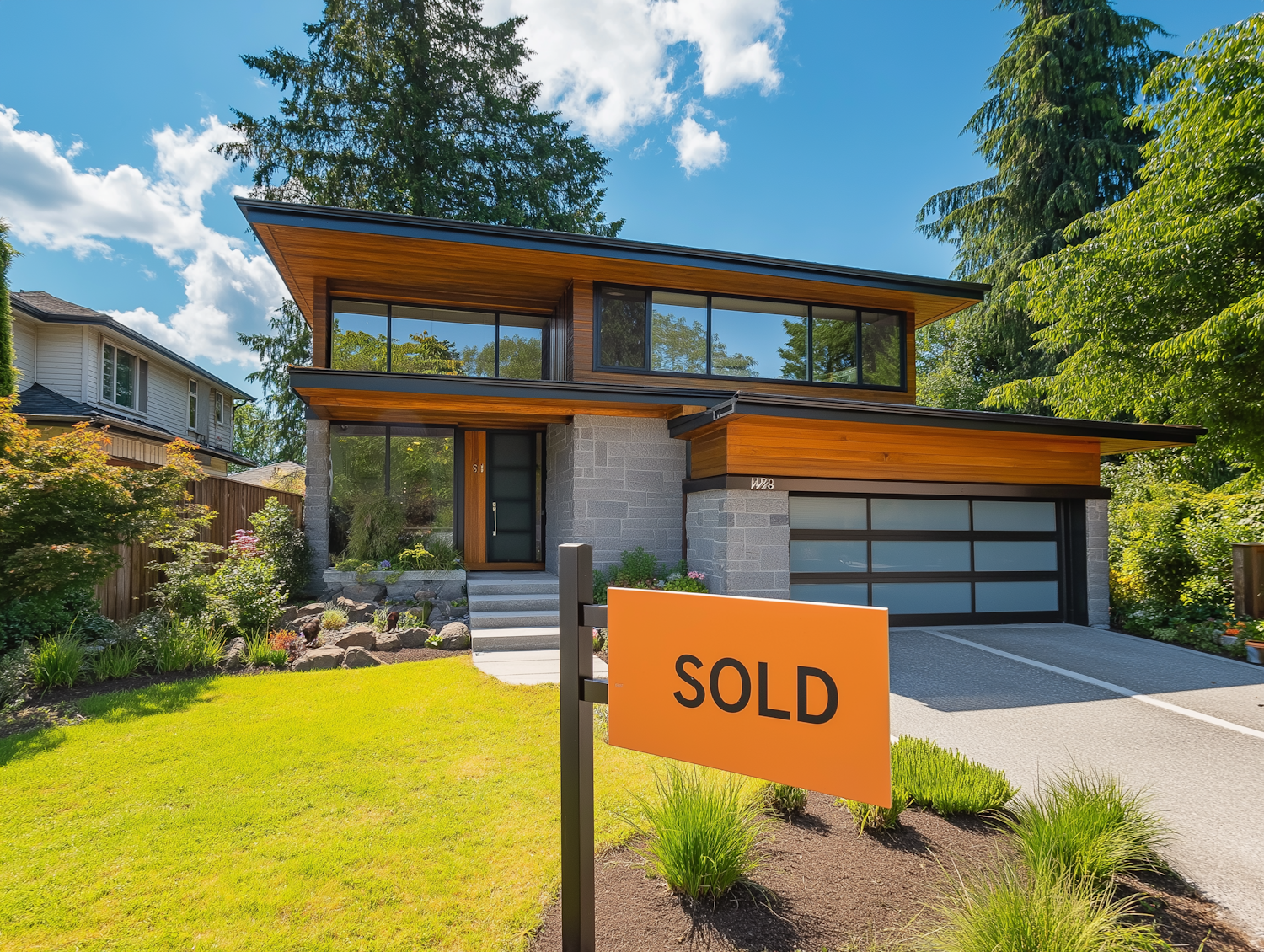Modern two-story house with large windows and 'SOLD' sign in lush neighborhood, surrounded by trees and clear skies.