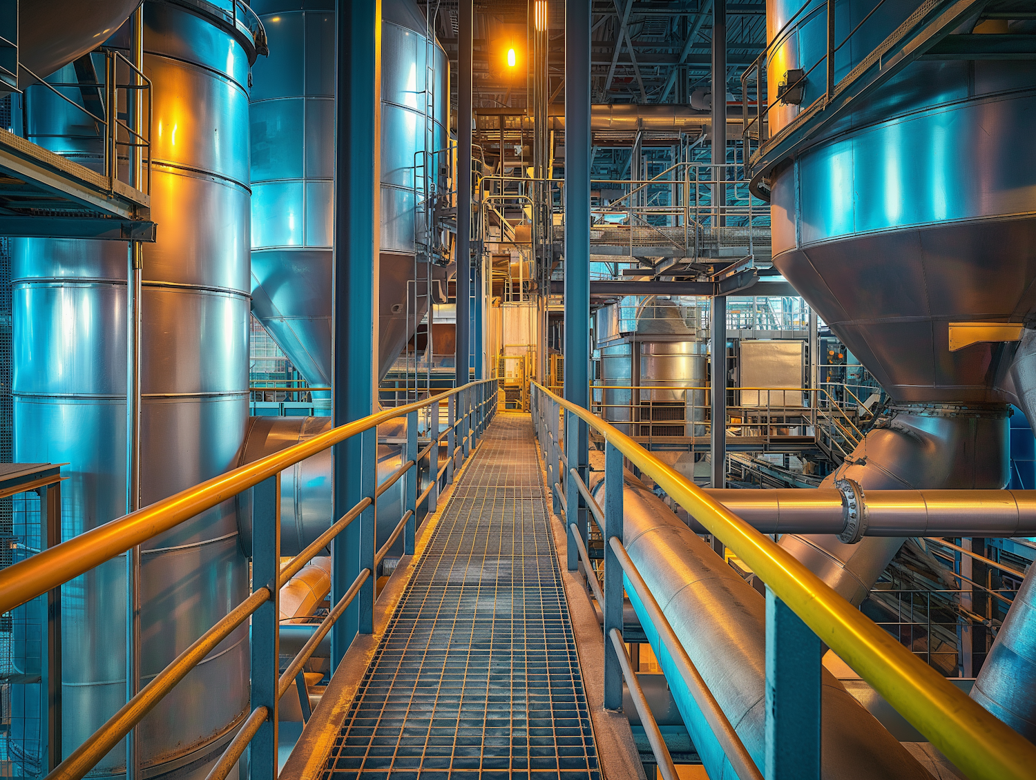 Industrial interior with metallic tanks, pipes, and a walkway. Warm and cool lighting creates a striking contrast in a modern facility.