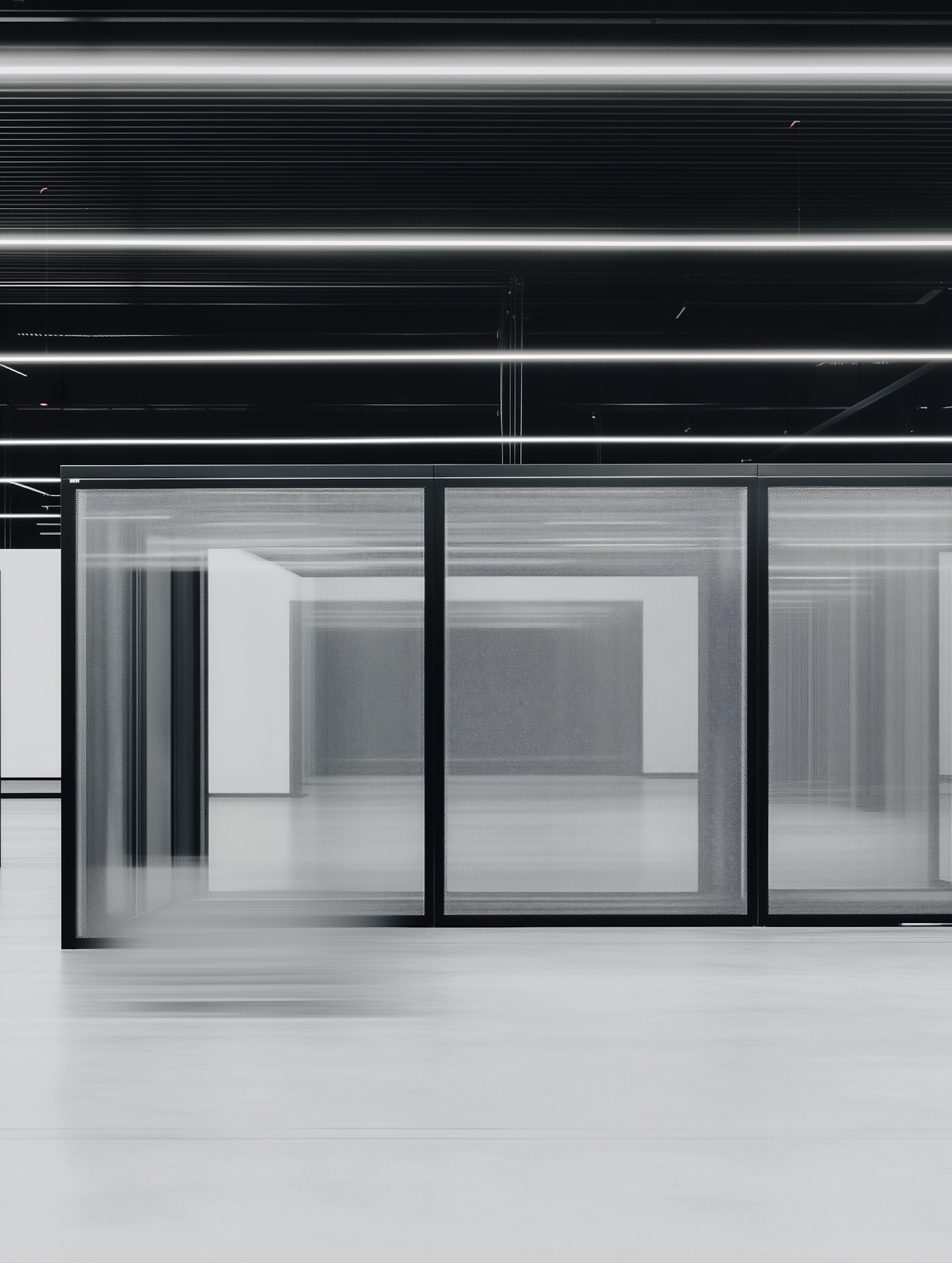 Minimalist industrial interior with glass panels, black frames, and motion blur. Bright white floor contrasts with dark ceiling and linear lights.