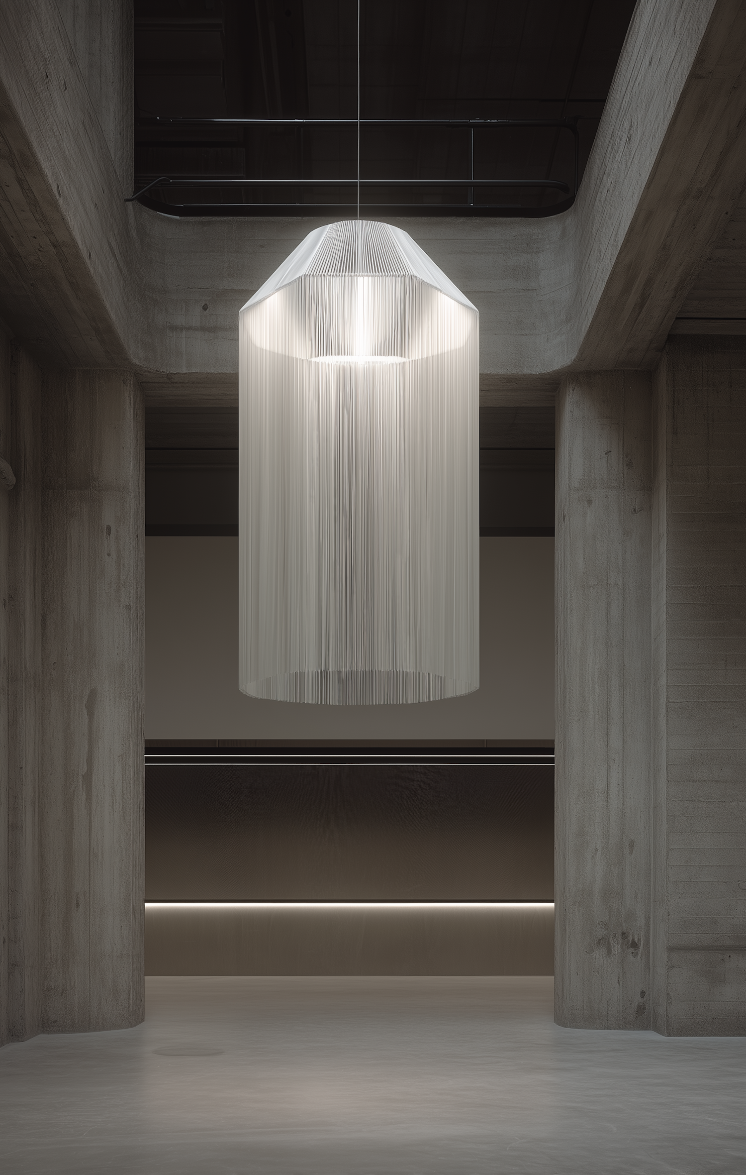 Modern interior with a striking cylindrical pendant light, concrete walls, and minimalist design. Perfect for industrial-chic inspiration.