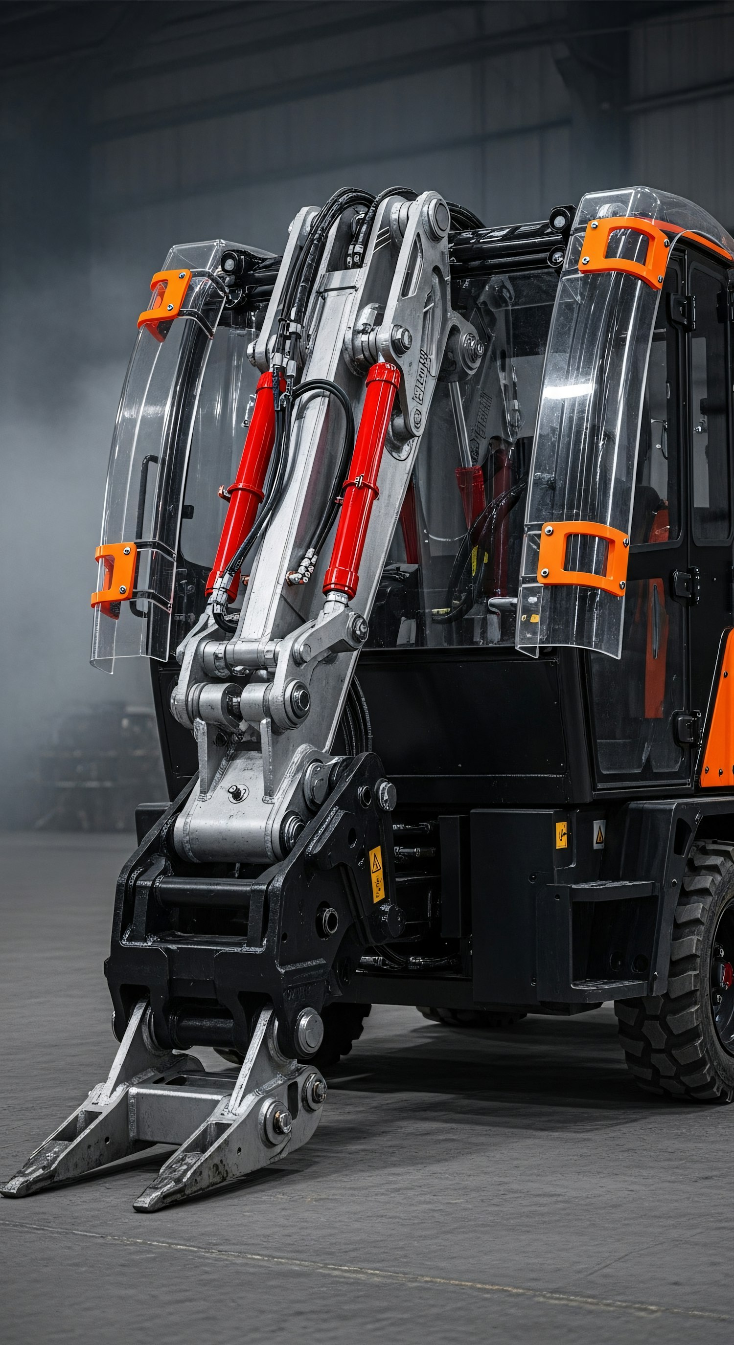 Close-up of a modern industrial machine with a hydraulic arm and claw, set in an industrial environment with a smoky backdrop.