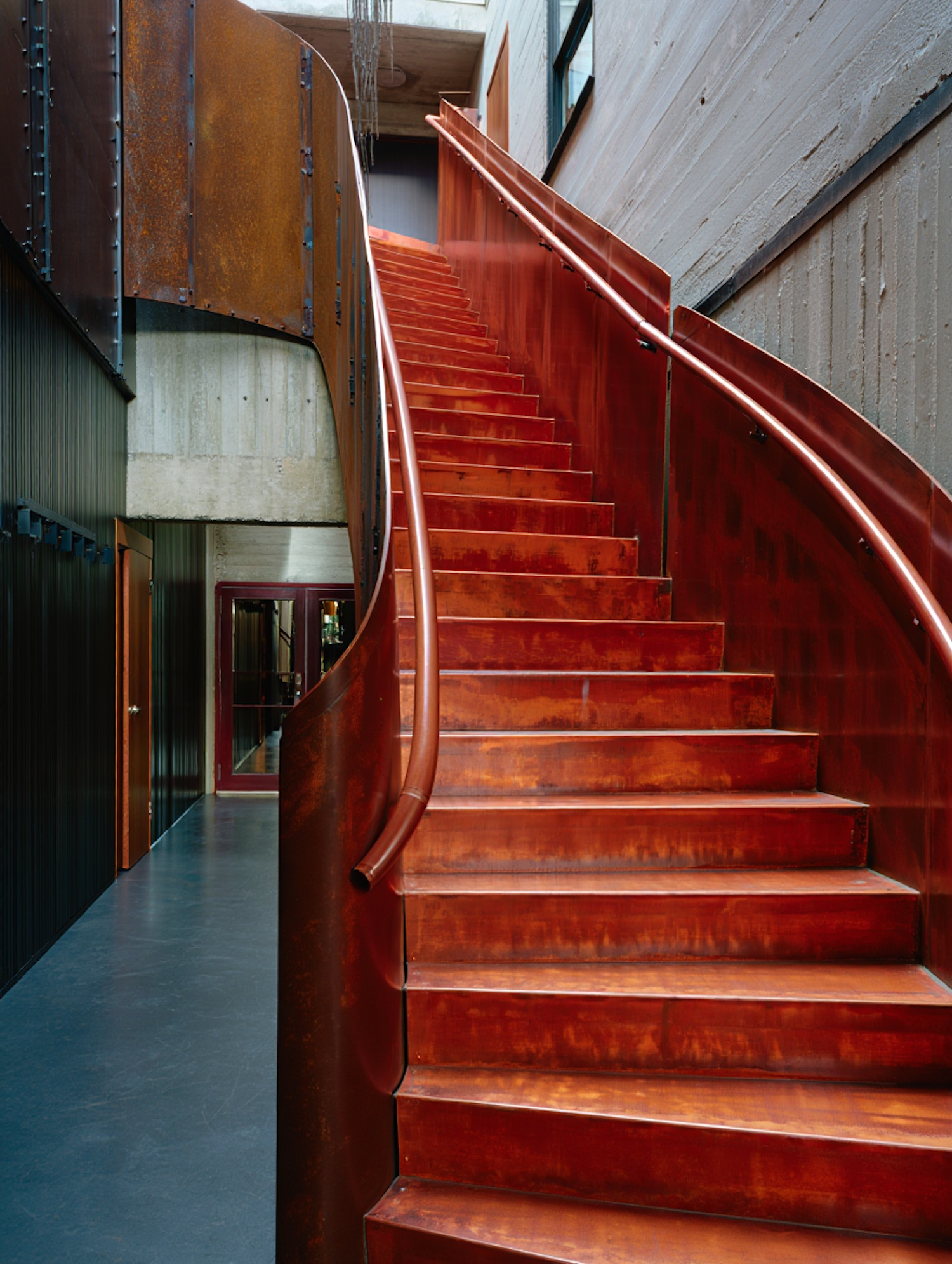 Rust-colored metal staircase in a modern industrial interior, blending polished and raw materials for a striking architectural design.