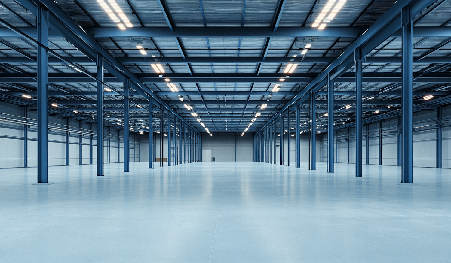 Spacious empty warehouse with blue steel beams, polished floor, and bright overhead lights, creating a modern industrial look.
