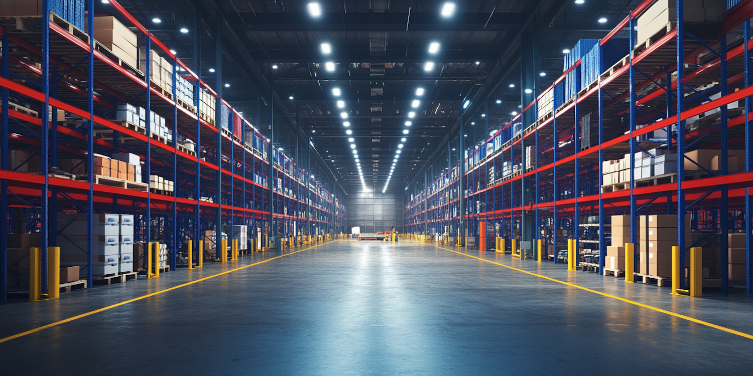 Spacious warehouse with organized shelves, bright lighting, and neatly stacked boxes, showcasing efficient storage solutions.