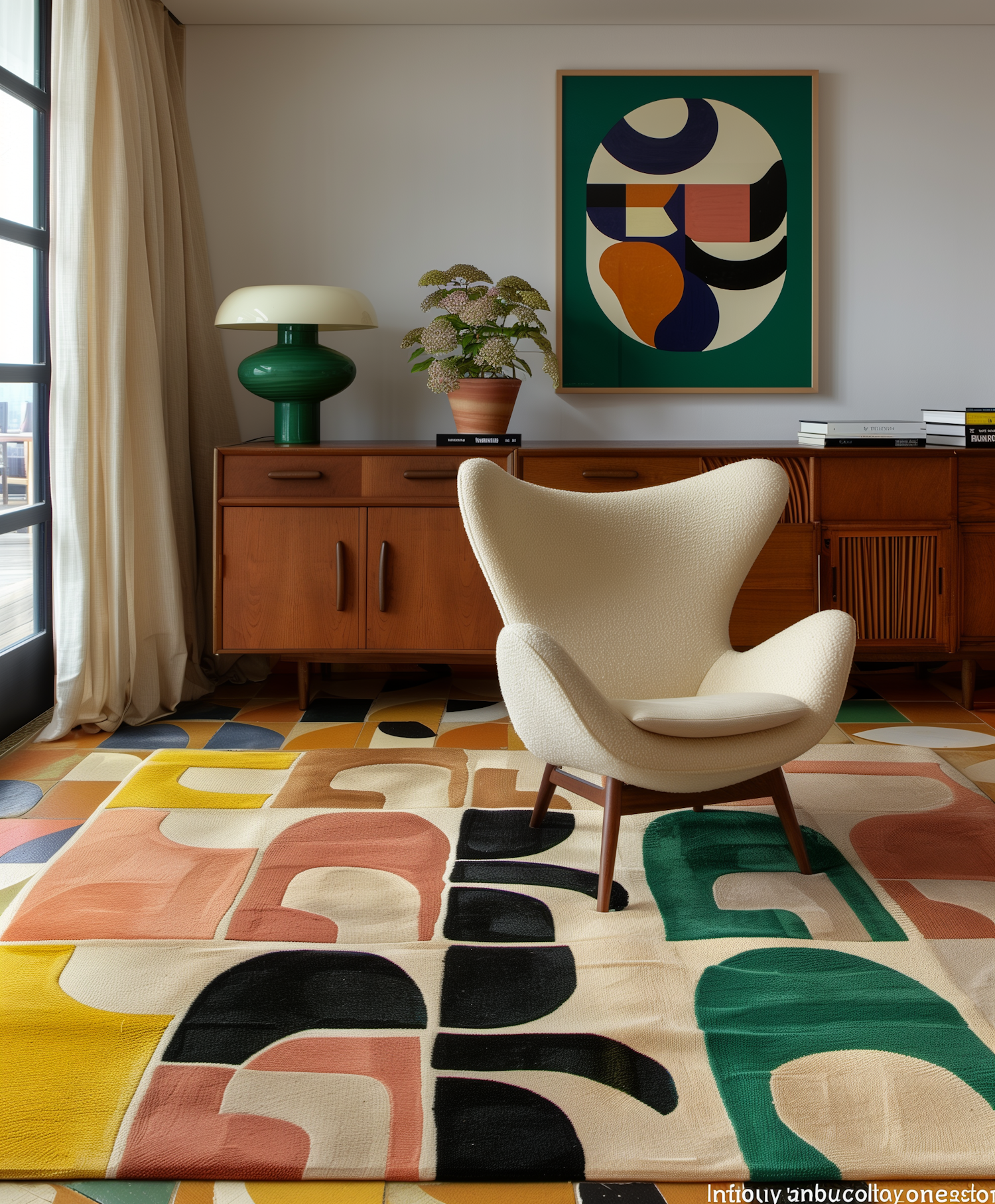 Mid-century modern living room with a geometric rug, abstract art, and a cream armchair. Warm wood tones and natural light enhance the space.