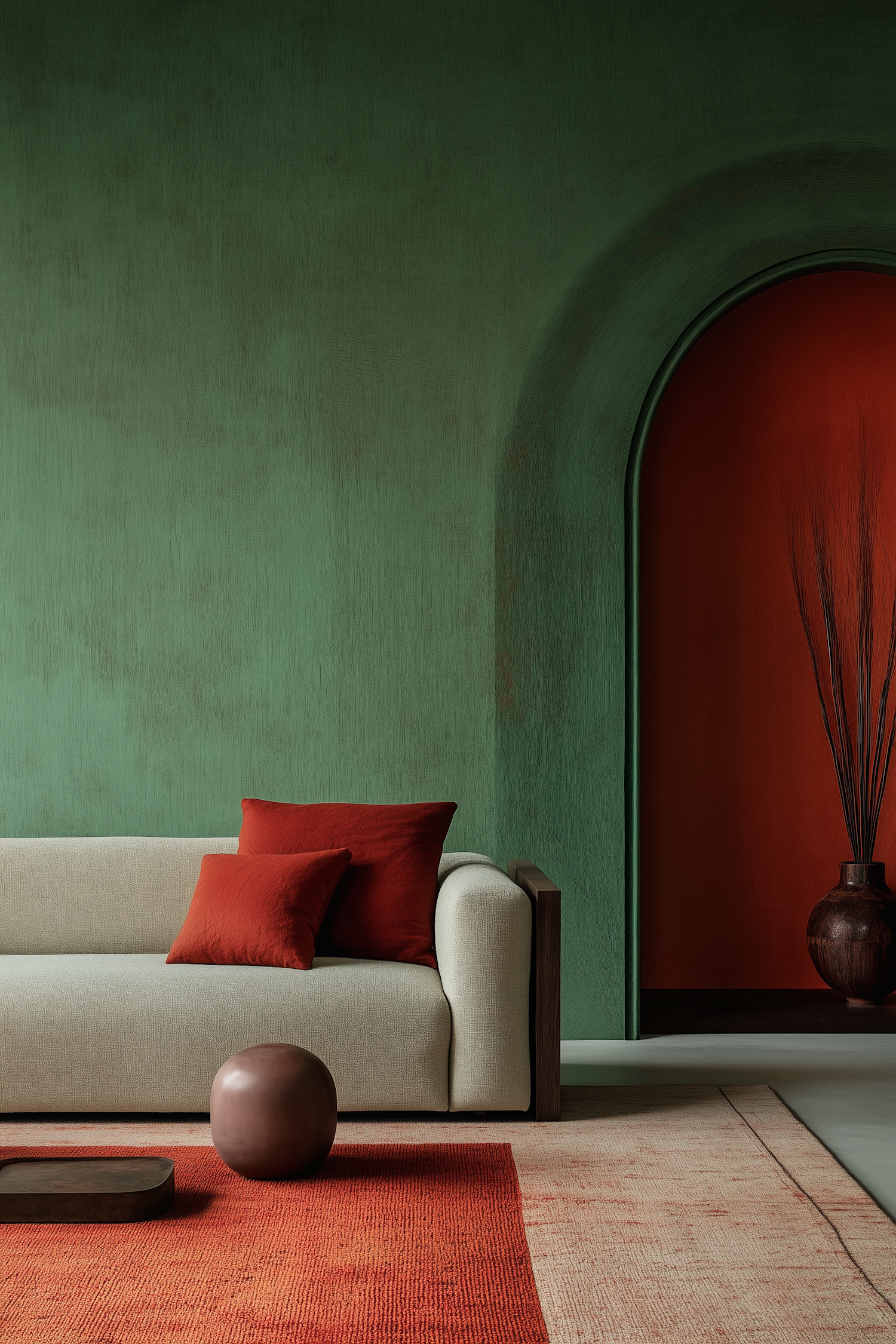 Modern living room with a cream sofa, red pillows, green walls, and a red accent arch. Warm tones and minimalist decor create a cozy vibe.