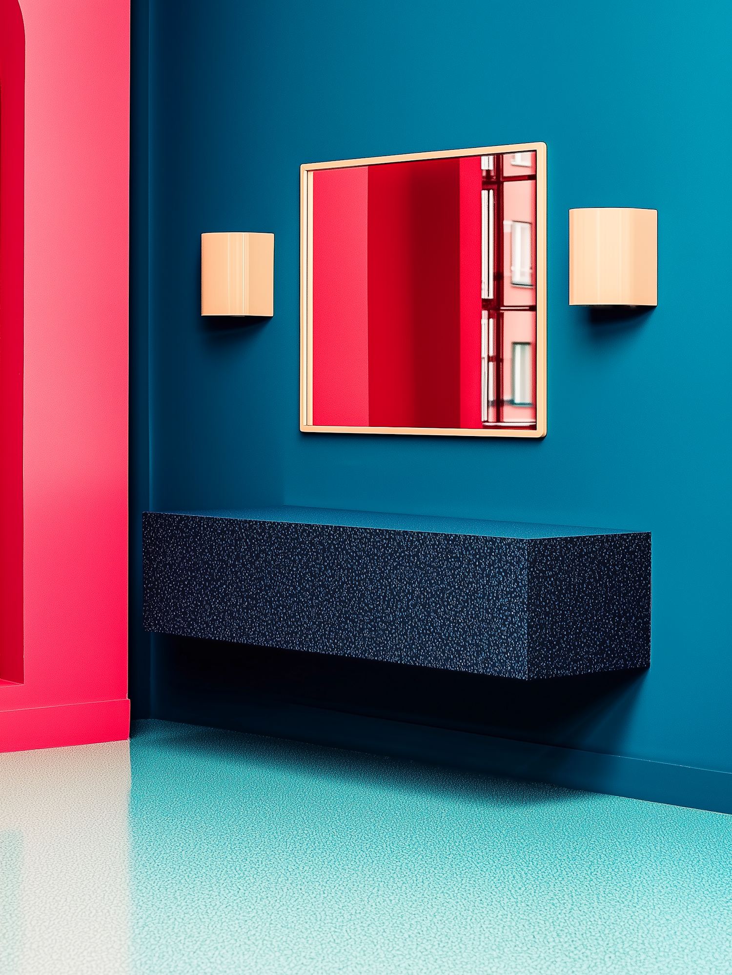 Modern interior with teal and red walls, gold-framed mirror, beige sconces, and a dark blue floating shelf. Bold and stylish design.