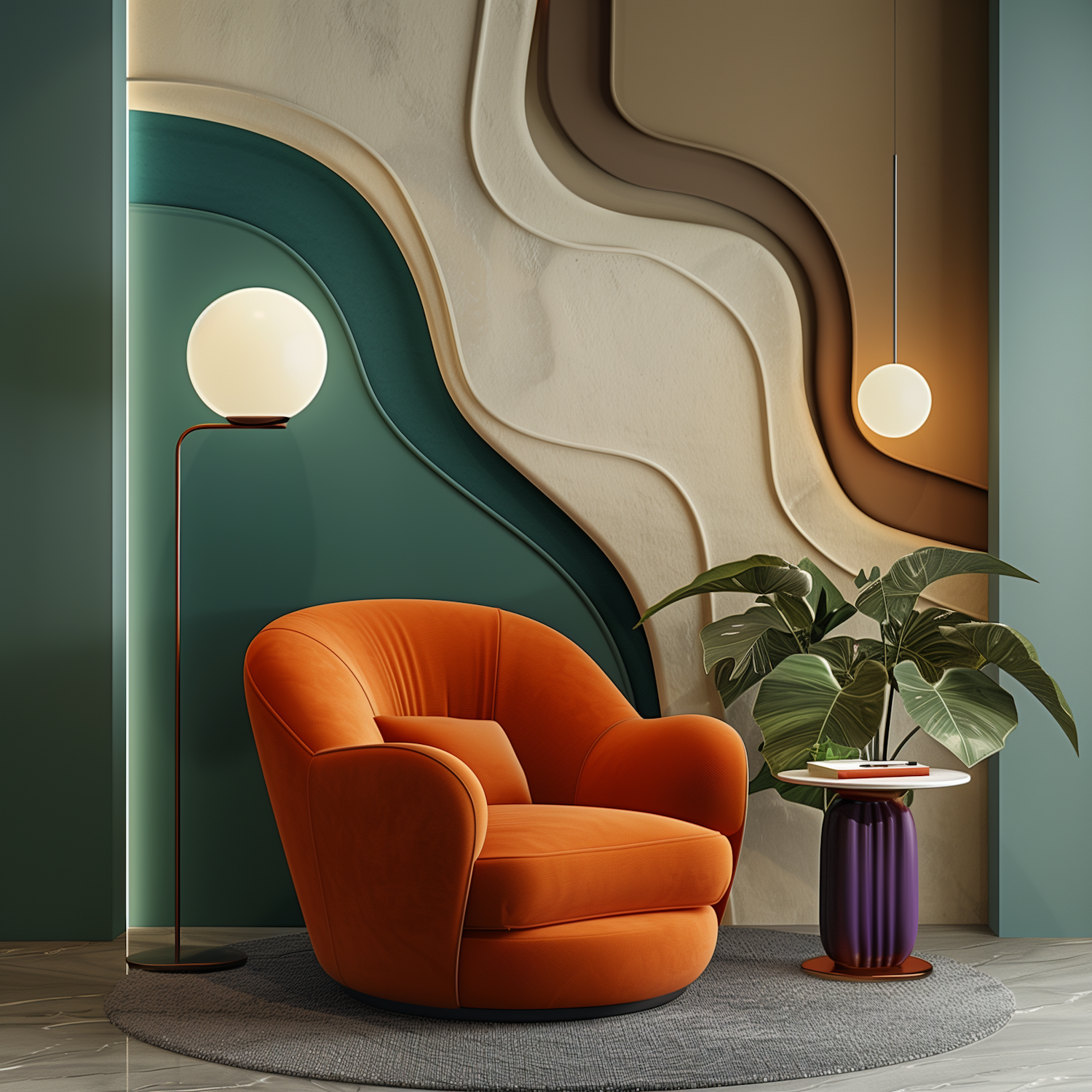 Modern interior with orange armchair, abstract wall art, and stylish lighting. Cozy and contemporary design with lush greenery.