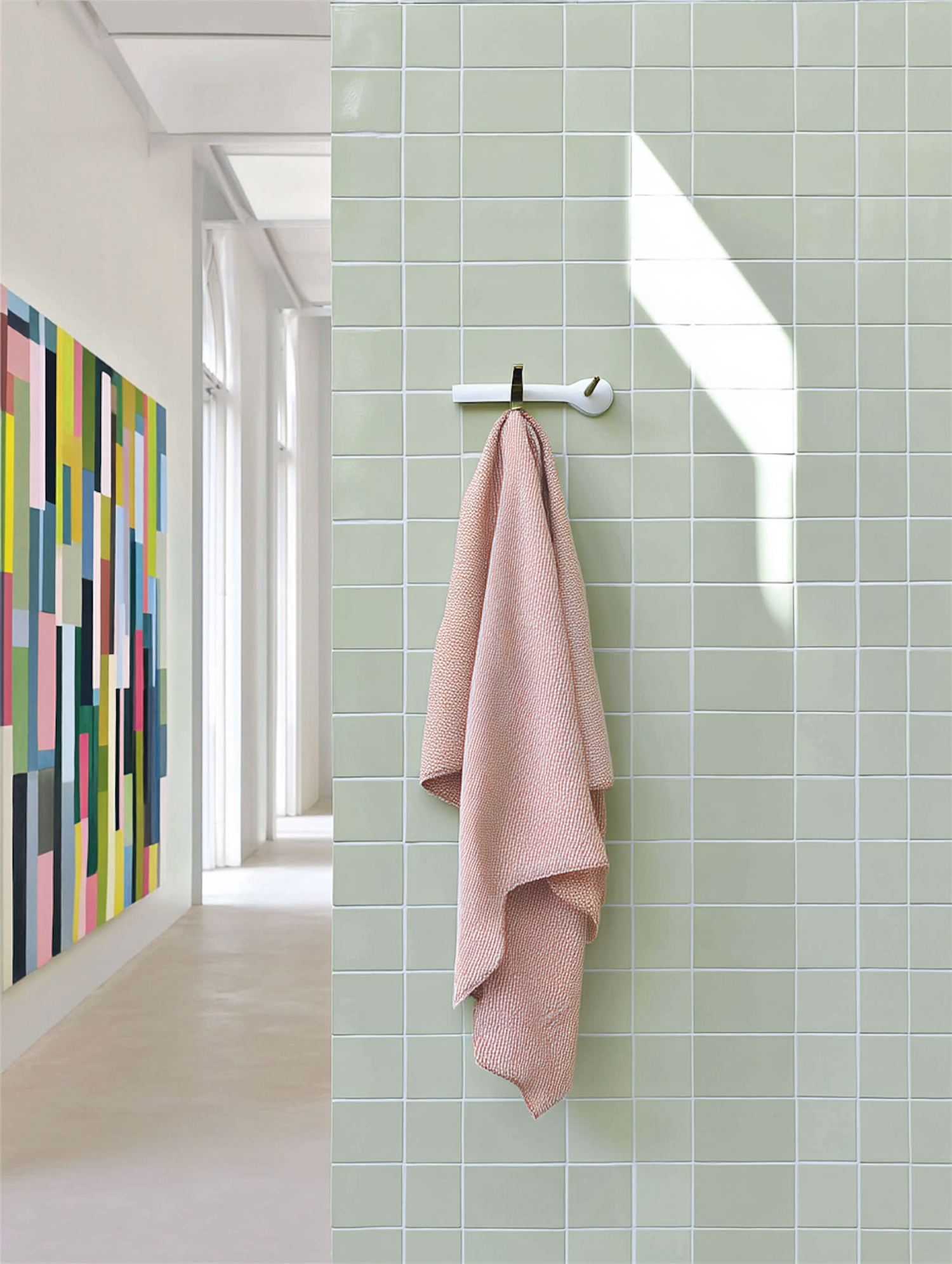Modern interior with light green tiles, a pink towel on a sleek hook, and vibrant abstract wall art in a bright, minimalist hallway.