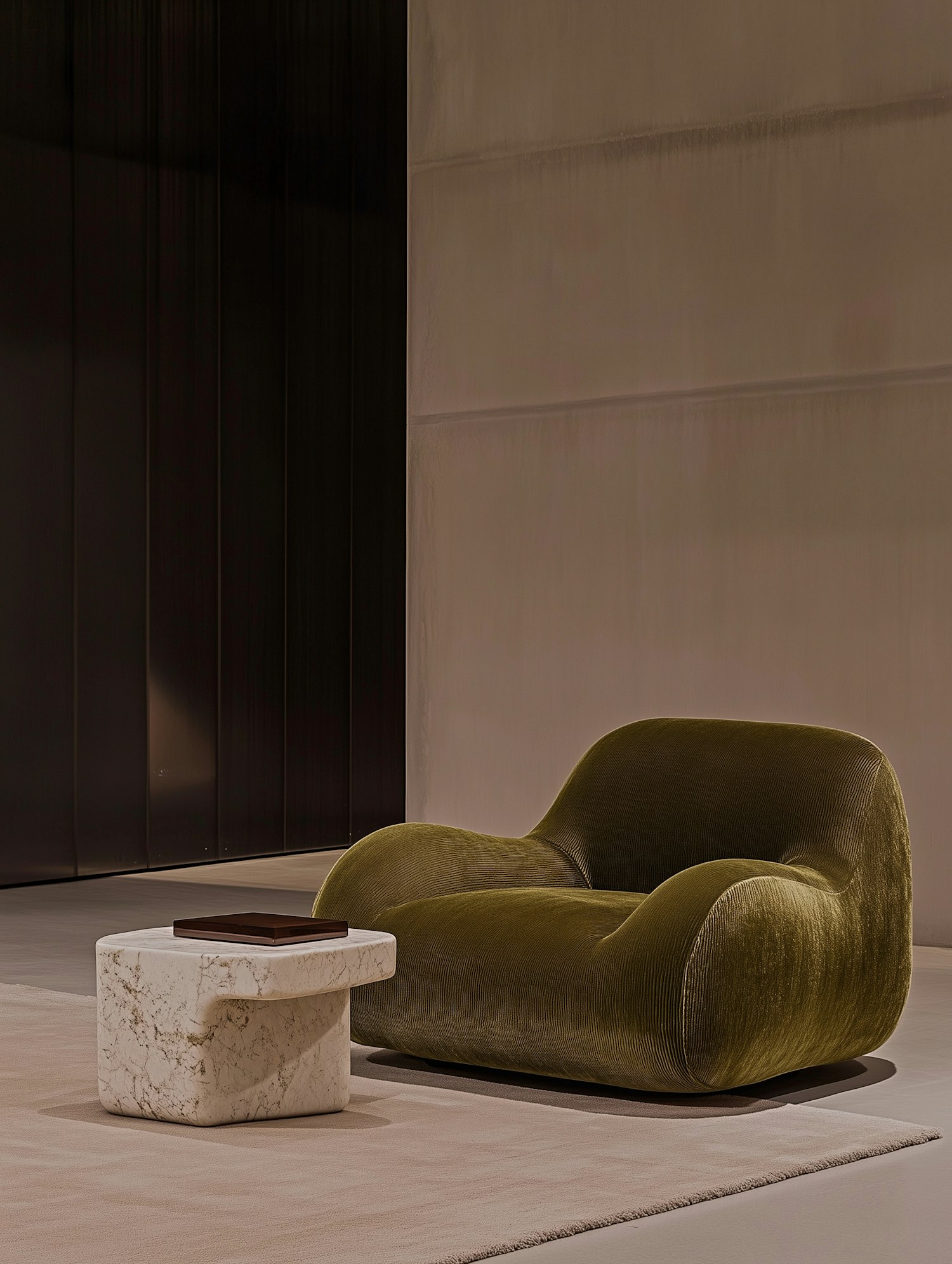 Modern olive-green armchair with a velvety texture paired with a sculptural white marble side table in a minimalist interior.