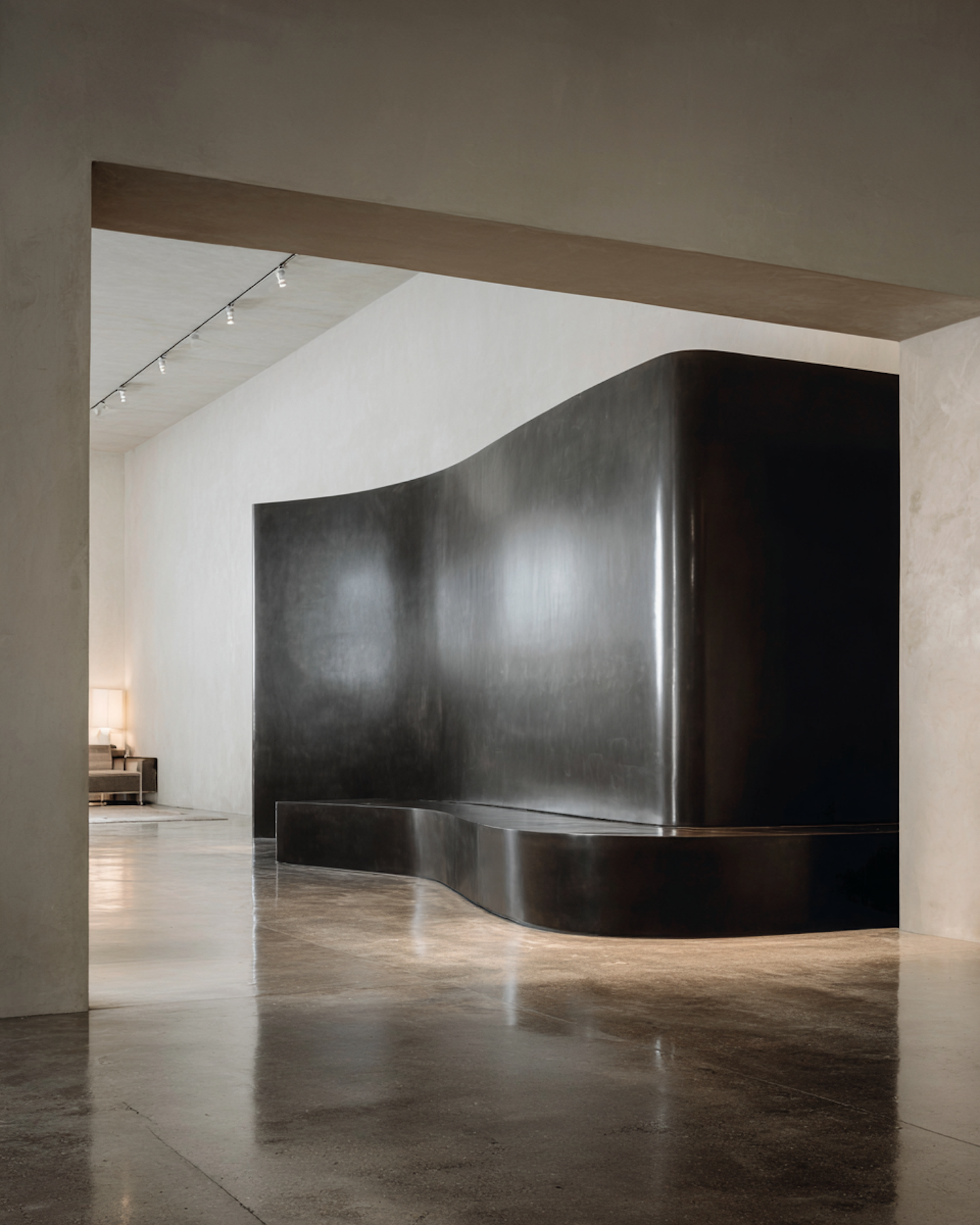 Modern minimalist interior with a curved black wall, polished concrete floor, and ambient lighting creating a sleek and elegant atmosphere.