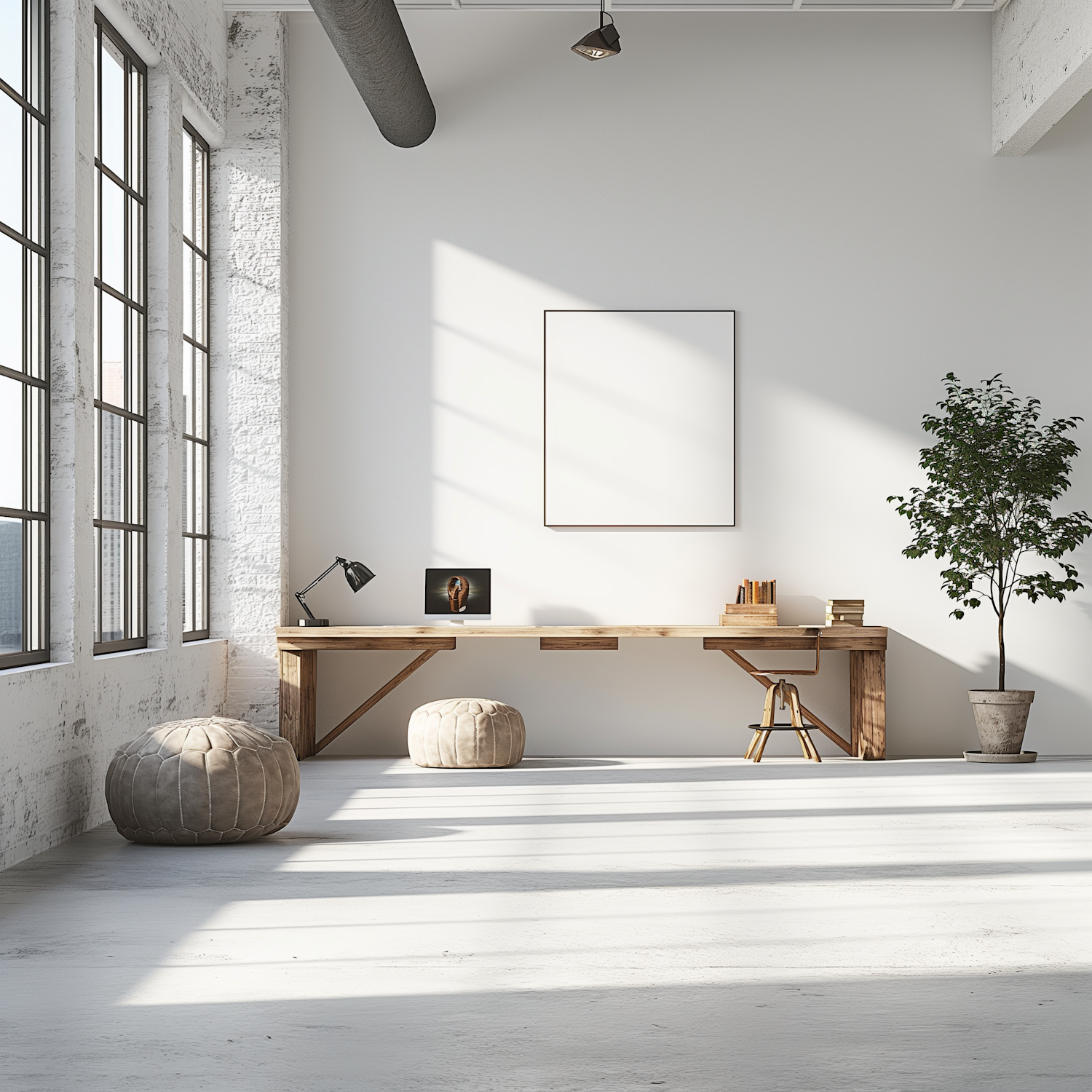 Minimalist room with wooden desk, large windows, poufs, and a potted plant. Natural light creates a serene atmosphere.