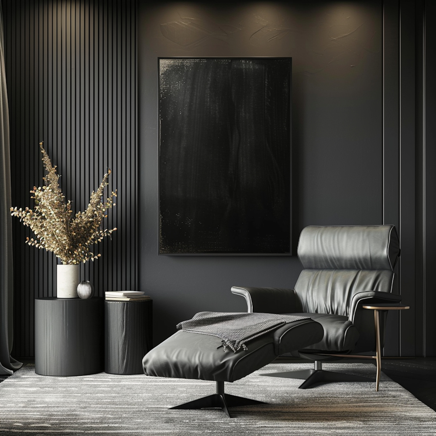 Modern minimalist interior with a black leather lounge chair, abstract art, and decorative vases on a textured rug.