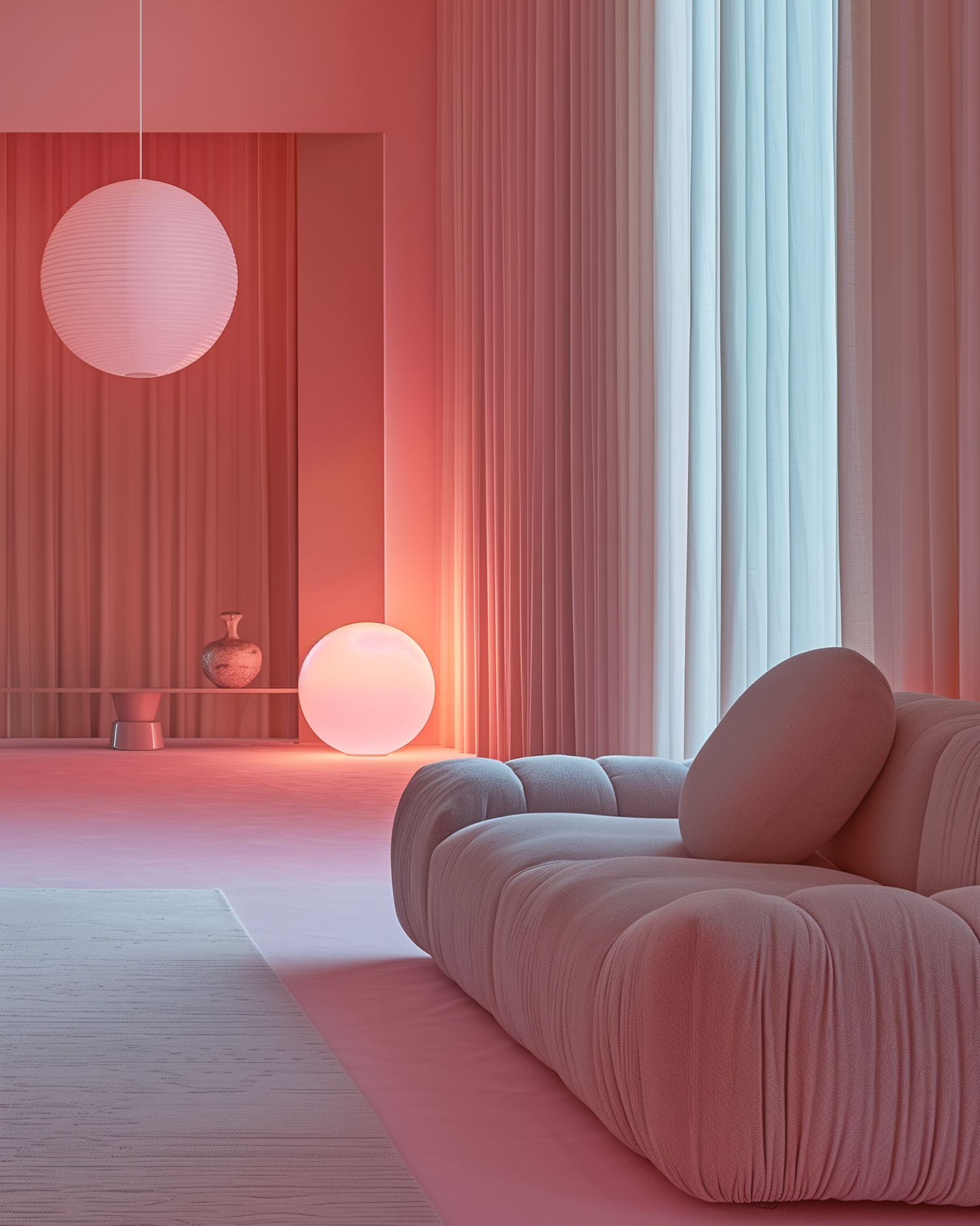 Minimalist pink-toned interior with a plush sofa, glowing spherical lamp, and soft lighting for a serene, modern ambiance.
