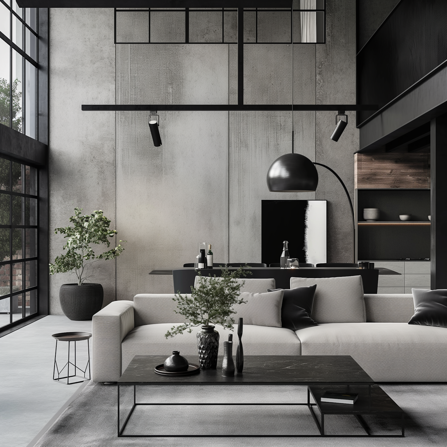 Modern minimalist living room with gray sofa, black coffee table, and large windows. Elegant design with natural light and open-plan kitchen.