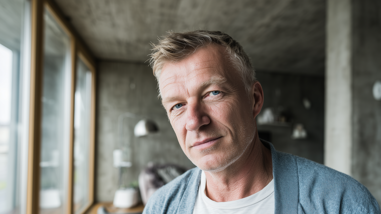 Portrait of a middle-aged man with light hair and blue eyes in a modern, well-lit interior with concrete walls and large windows.