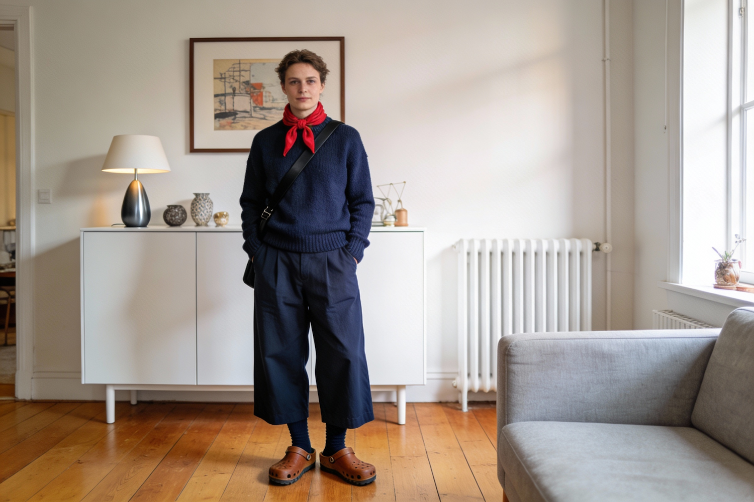 A stylish individual stands confidently in a well-lit Scandinavian-inspired interior with wooden flooring, a light gray couch, a white radiator, and a white cabinet topped with a lamp and decorative items. A framed artwork hangs on the wall. They wear a navy blue sweater with a red scarf tied around the neck, wide-legged navy blue pants, dark socks, and brown clogs. A black strap crosses the chest, suggesting a bag. The lighting is soft and natural, casting gentle shadows that highlight the textures of the knitwear and the warm tones of the room. The composition is editorial and composed, emphasizing comfort, color harmony, and modern Scandinavian minimalism