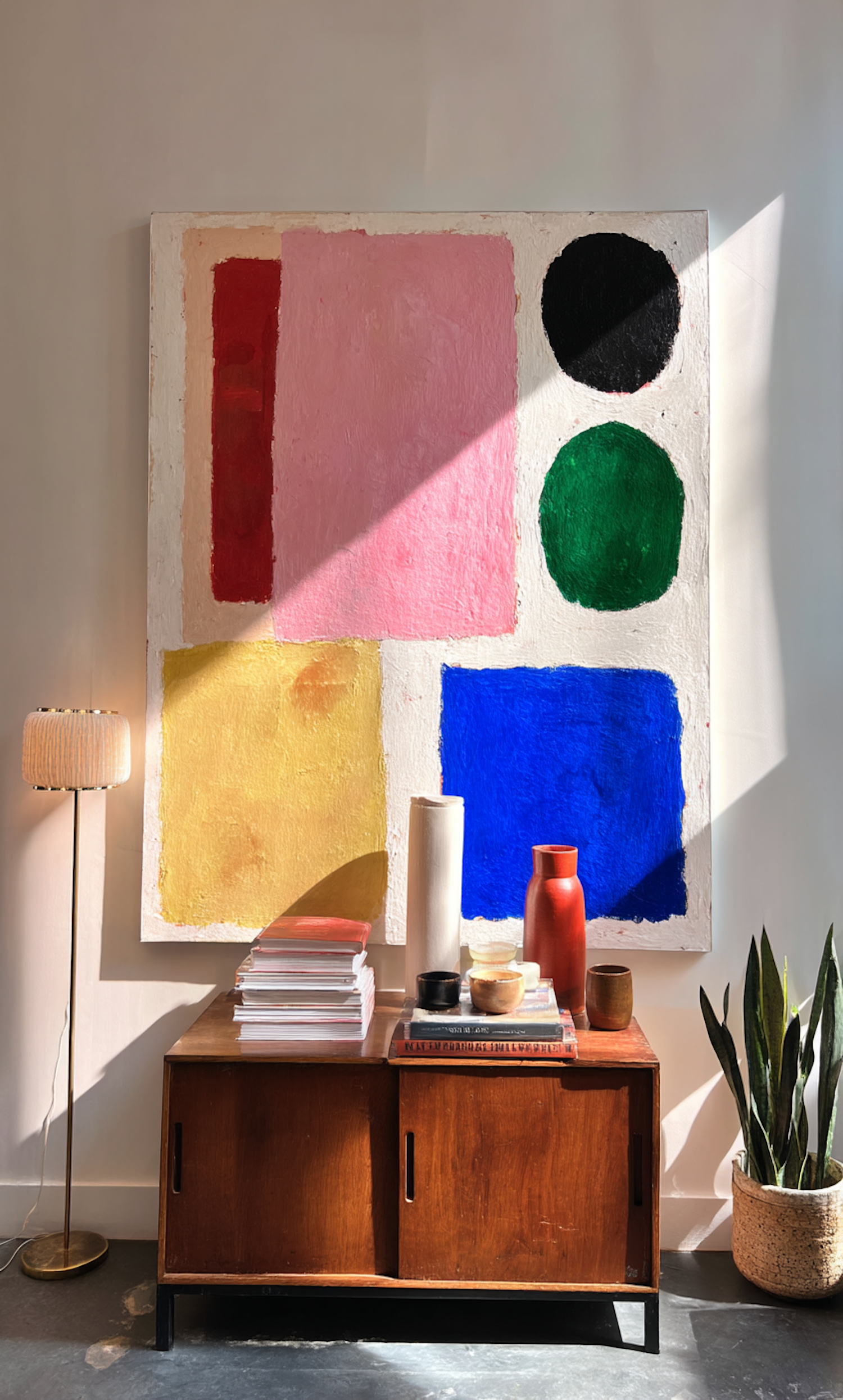 Bright and modern interior with a bold abstract painting, mid-century cabinet, ceramics, and a snake plant bathed in natural sunlight.