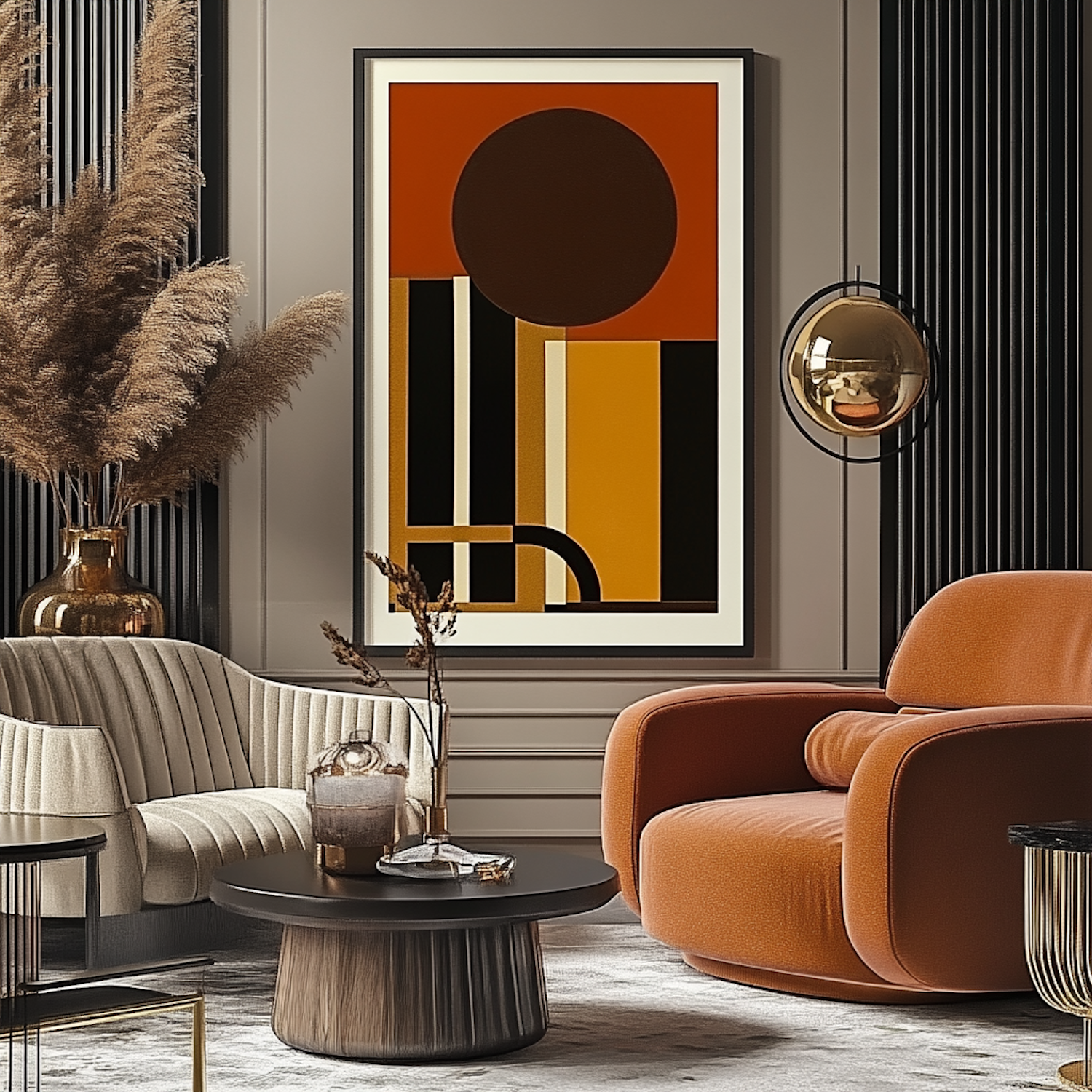 Modern living room with abstract art, terracotta armchair, beige ribbed chair, and pampas grass for a chic, cozy vibe.