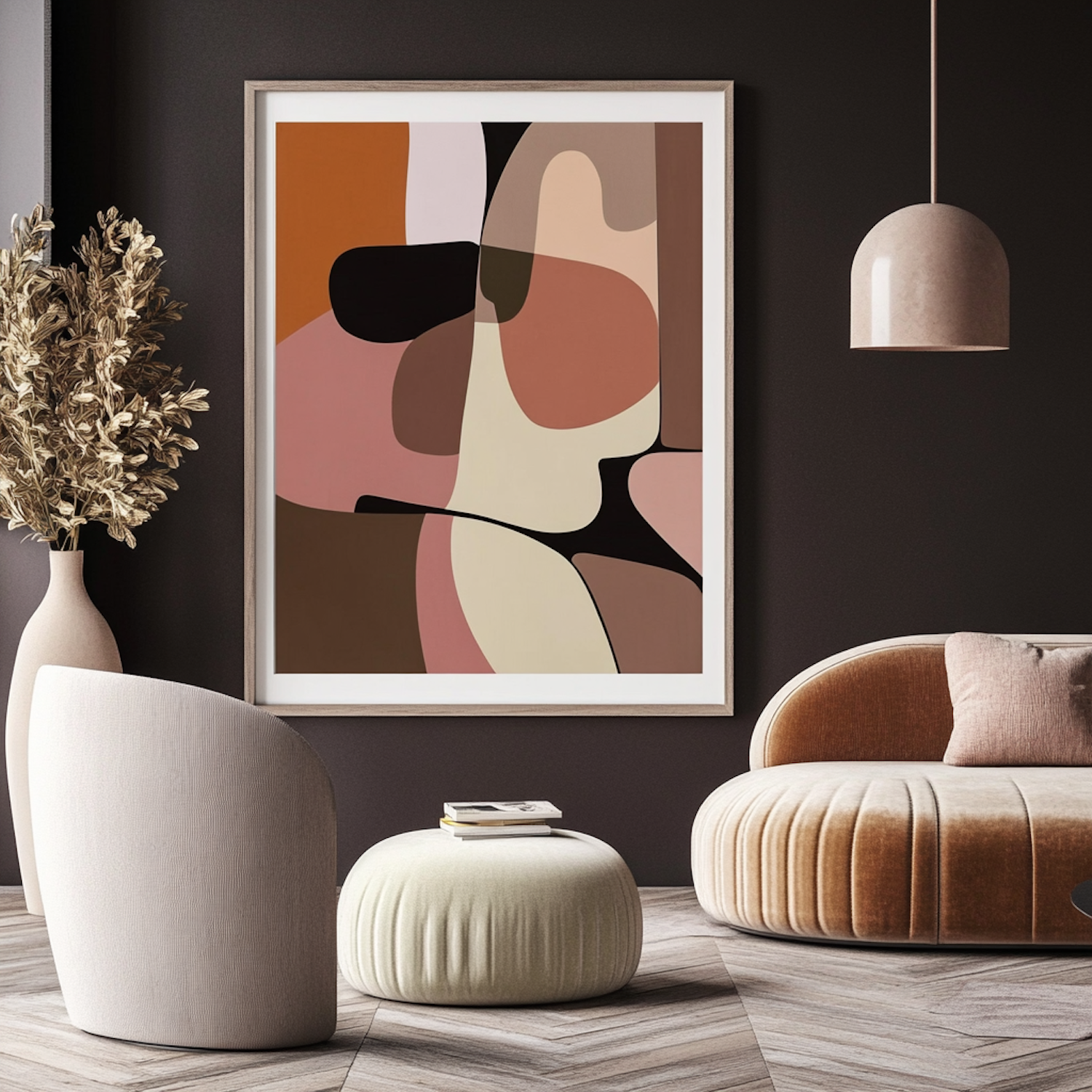 Modern living room with abstract art, plush sofa, and elegant decor in earthy tones. Perfect blend of style and comfort.