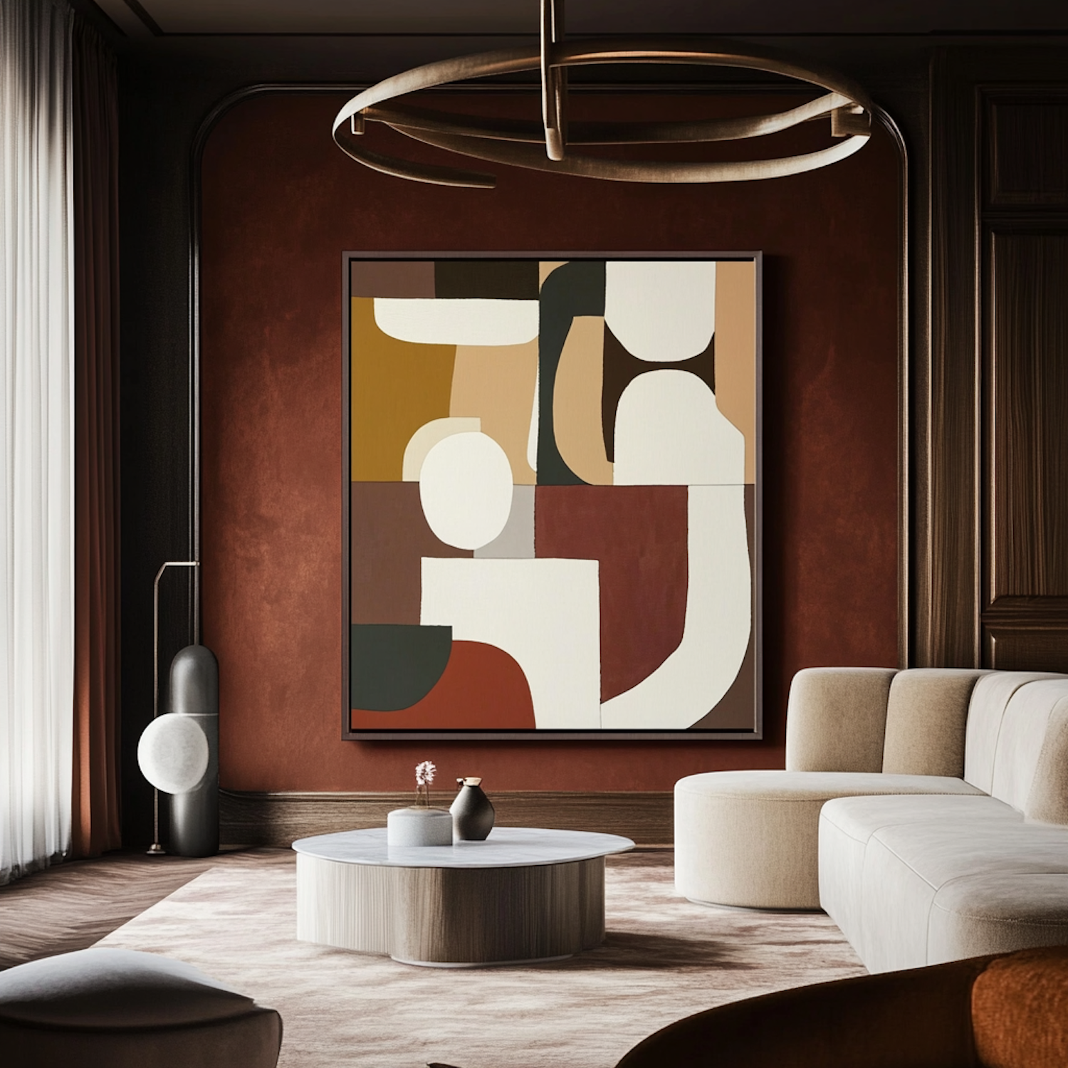 Modern living room with abstract art, cream sofa, round coffee table, and elegant lighting. Earthy tones create a warm ambiance.