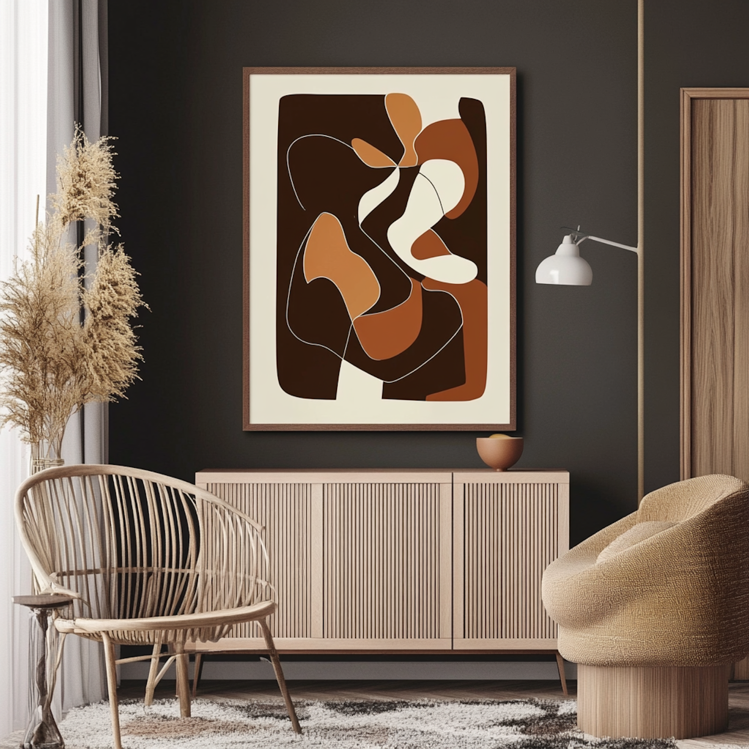 Stylish living room with abstract art, wicker chair, and cozy armchair. Earthy tones and modern decor create a warm, inviting space.