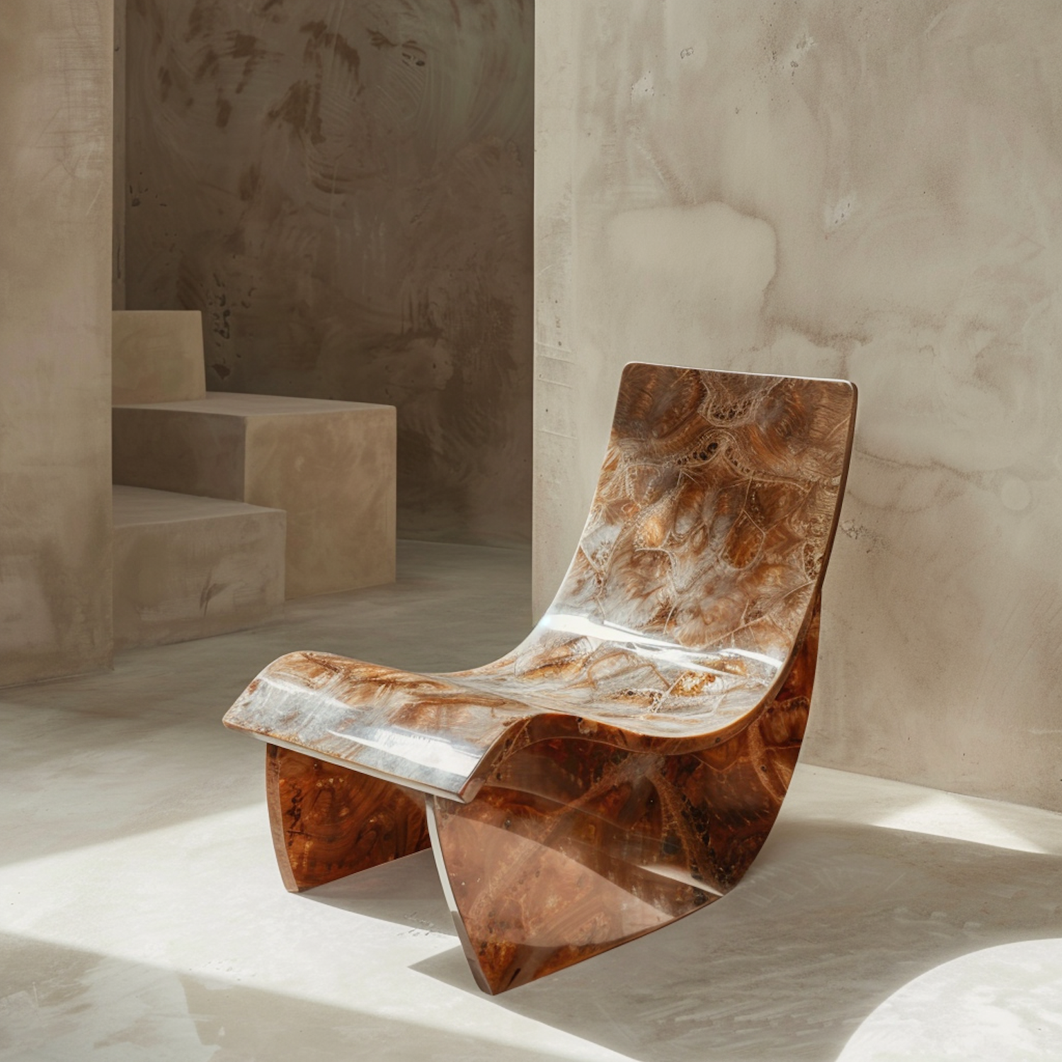Sleek, modern chair with marbled design in a minimalist room, highlighted by sunlight and neutral tones for a serene ambiance.