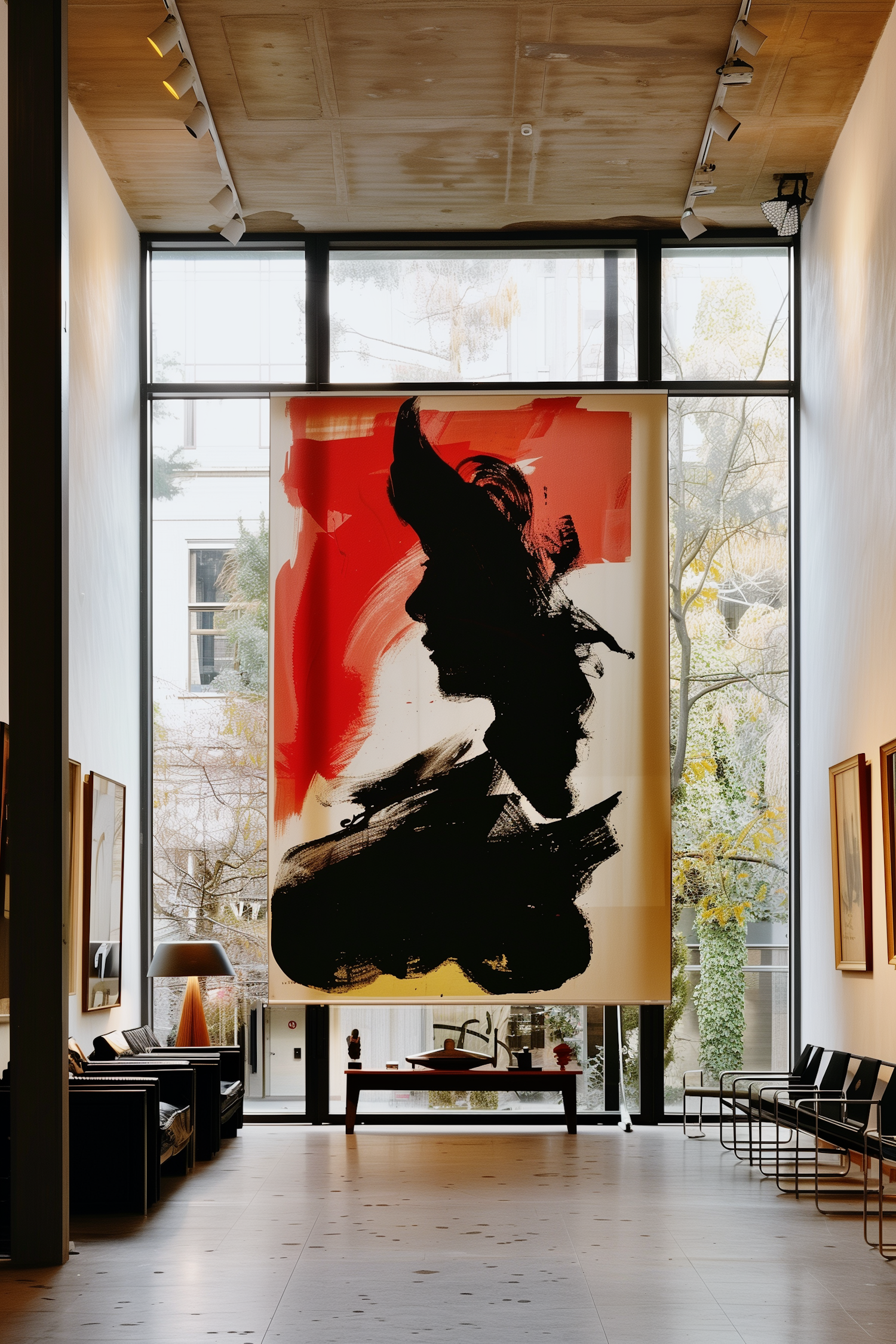 Modern art gallery with a striking abstract painting, featuring bold black and red colors, in a minimalist, well-lit space.