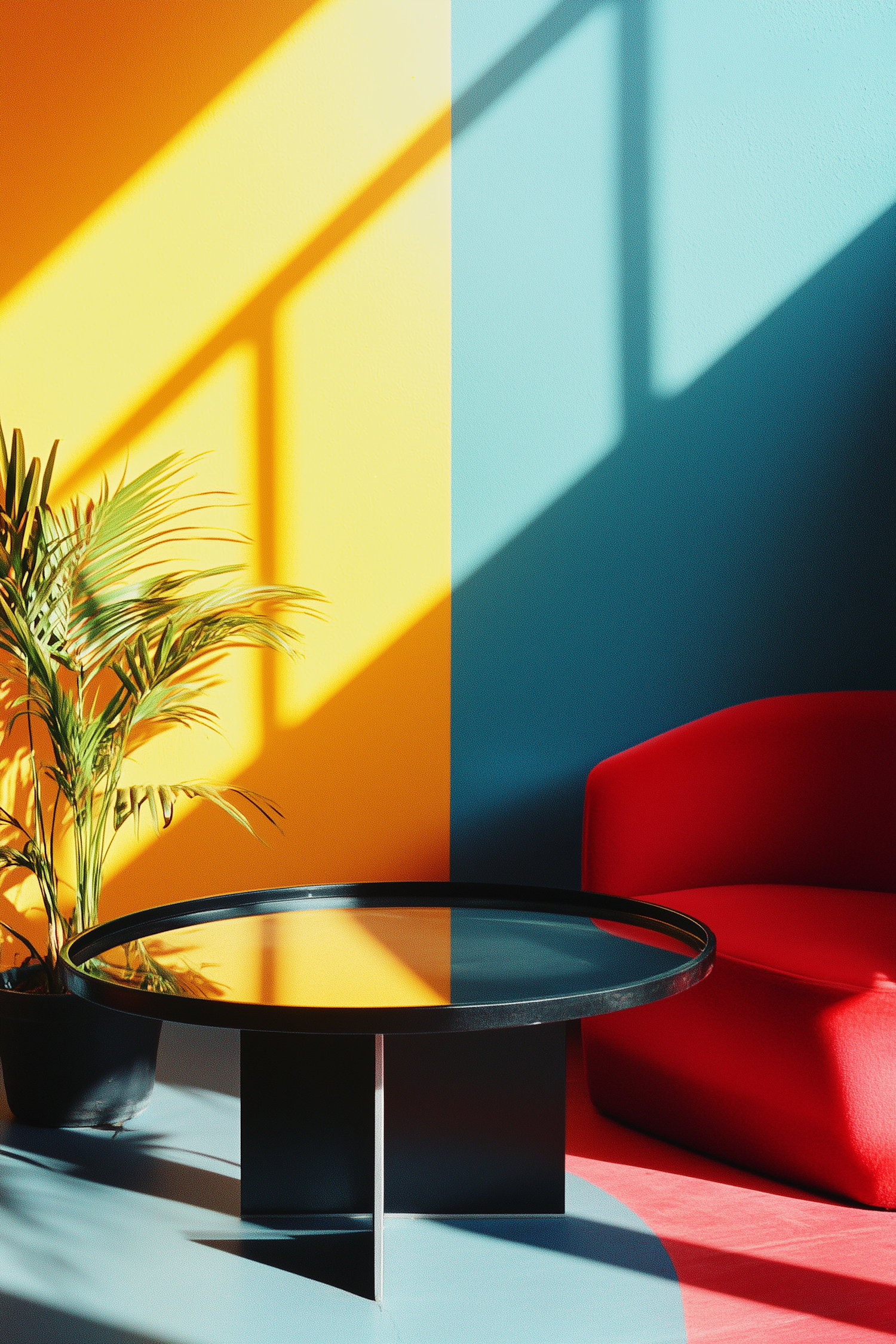 Vibrant modern interior with yellow and teal walls, a red sofa, black coffee table, and green plant in sunlight.