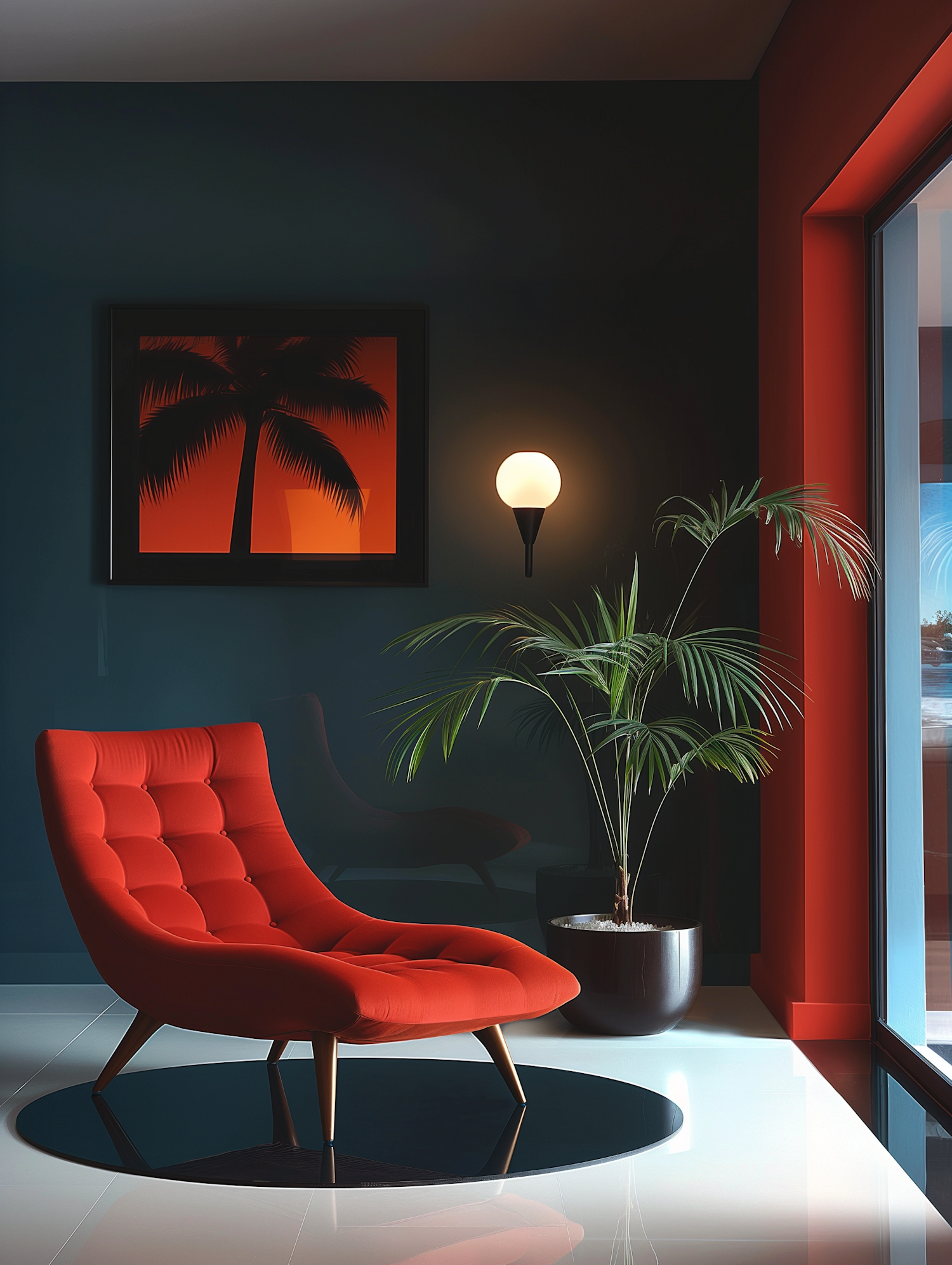 Modern interior with a red lounge chair, palm plant, and sunset artwork. Bold colors and sleek design create a stylish ambiance.