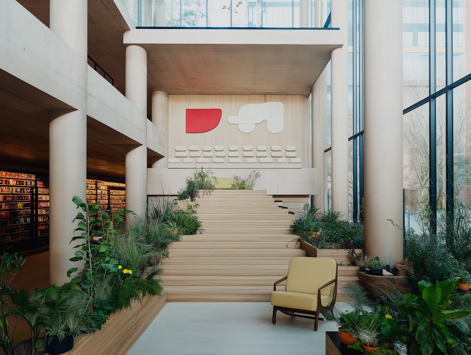 Modern interior with wooden stairs, lush greenery, abstract art, and floor-to-ceiling windows for a natural, minimalist aesthetic.