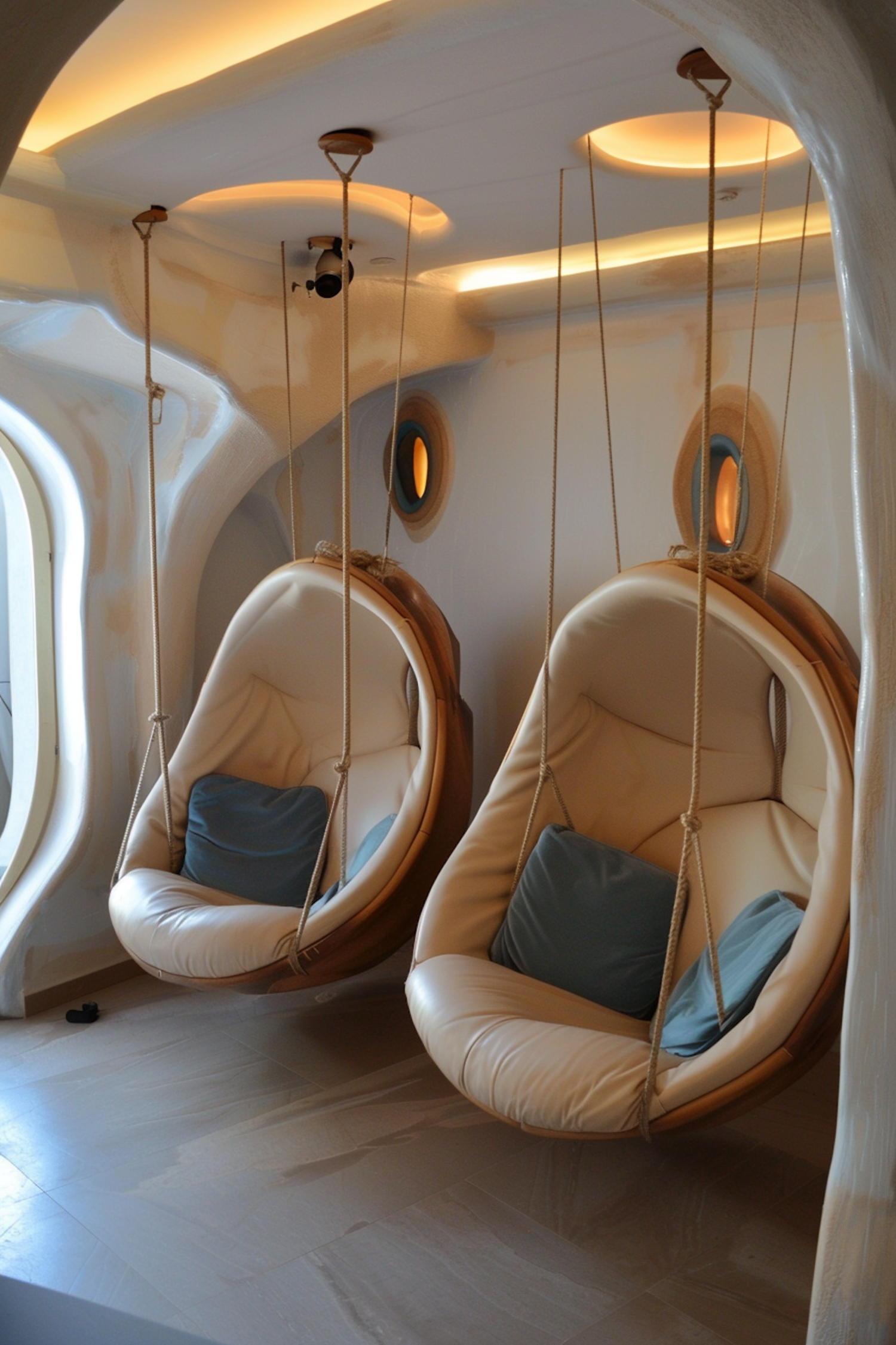 Modern hanging chairs with blue cushions in a stylish room with warm lighting and neutral tones.
