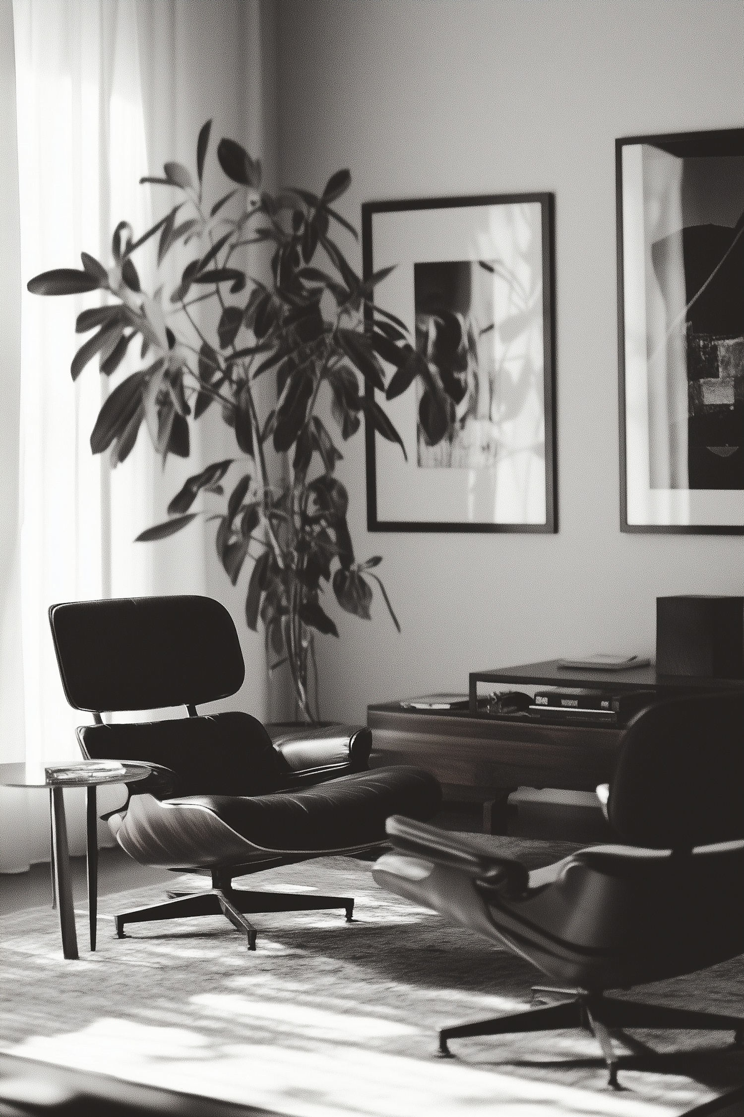 Modern living room with black leather lounge chairs, abstract art, and a large potted plant. Soft light creates a serene ambiance.