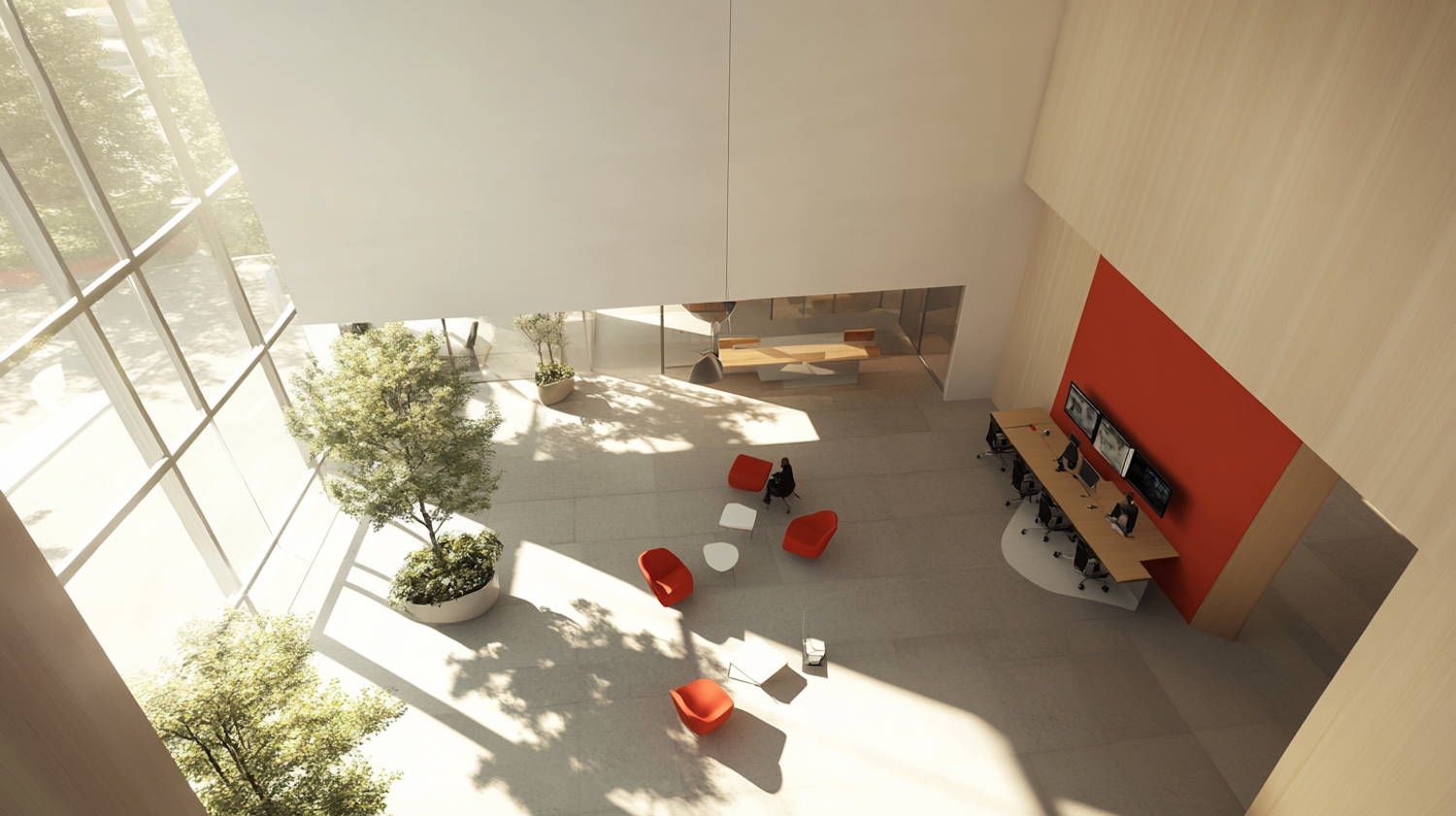 Modern interior with red chairs, large windows, and a vibrant workspace. Natural light and greenery create an inviting atmosphere.