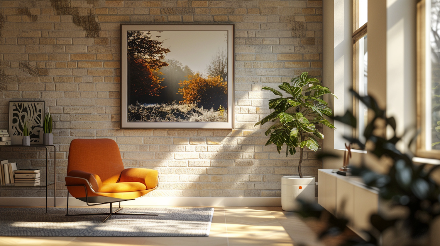 Cozy living room with orange armchair, brick wall, and autumn landscape art. Sunlit space with modern decor and lush green plant.