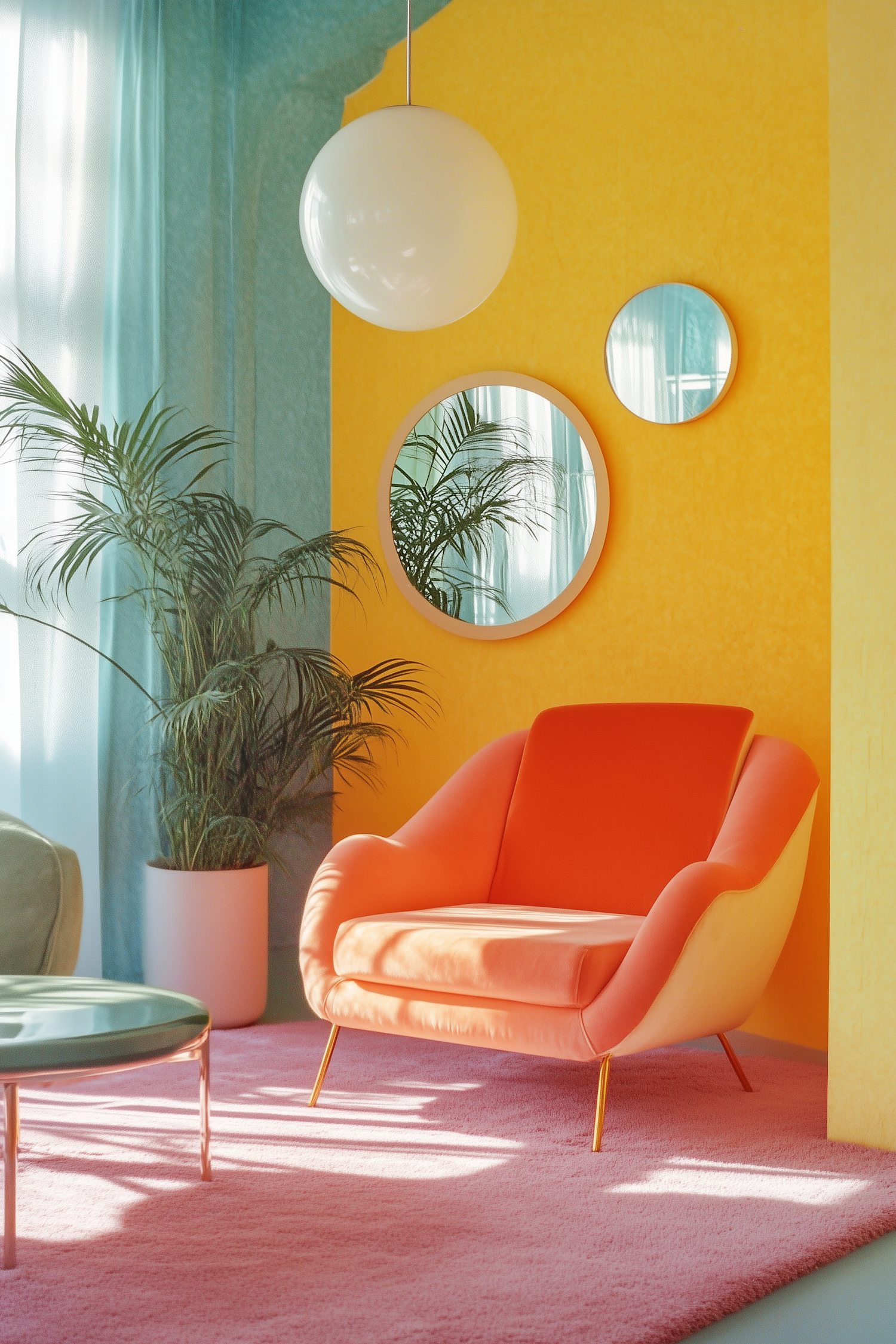 Bright modern interior with orange armchair, pink carpet, yellow wall, circular mirrors, lush plant, and turquoise curtains.